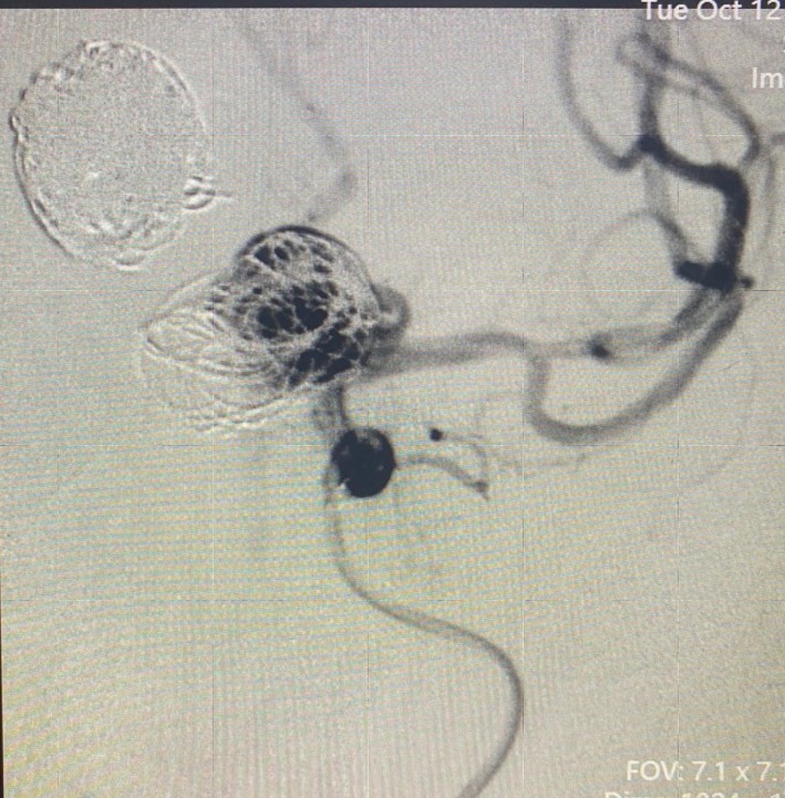 病人术后神经功能正常,在随后的2周观察期间,患者神经功能平稳如常,身体状况良好。于是决定处理前循环床突上段巨大动脉瘤。