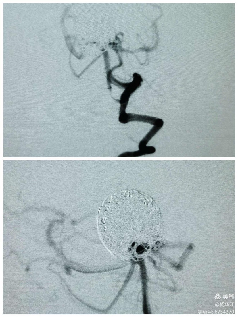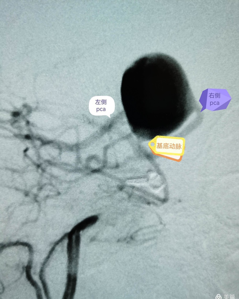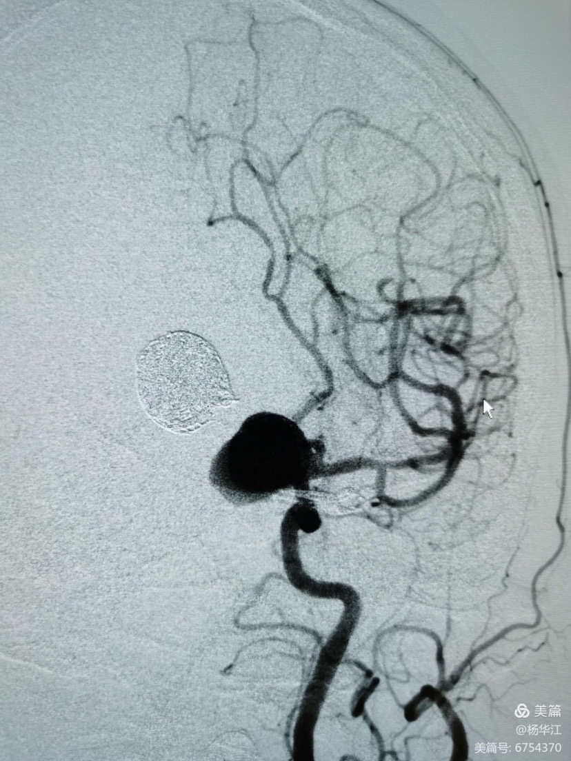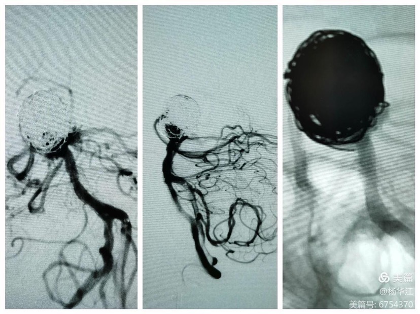 术中先行后循环造影显示:动脉瘤几乎完全不显影,各分支显影良好。这个效果还是有些出乎我们的意料的好,大概率消除了迟发性出血这个隐患。