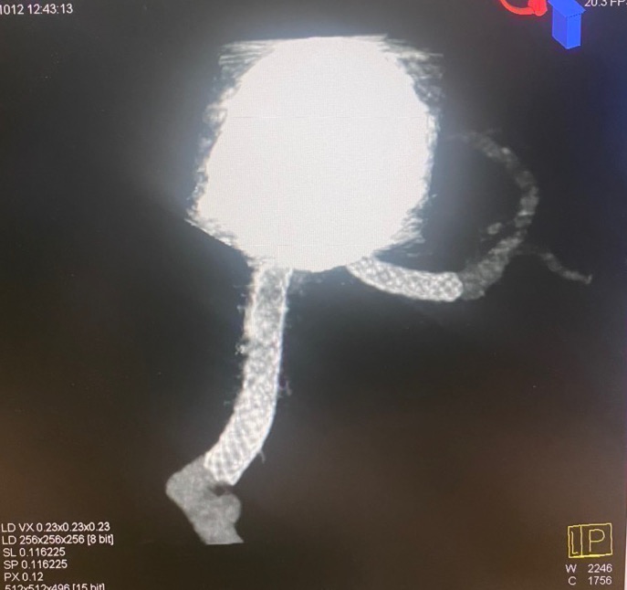 填两枚大圈后,动脉瘤下半部分已经不显影,此时见动脉瘤上半部分射流明显,直冲瘤顶。