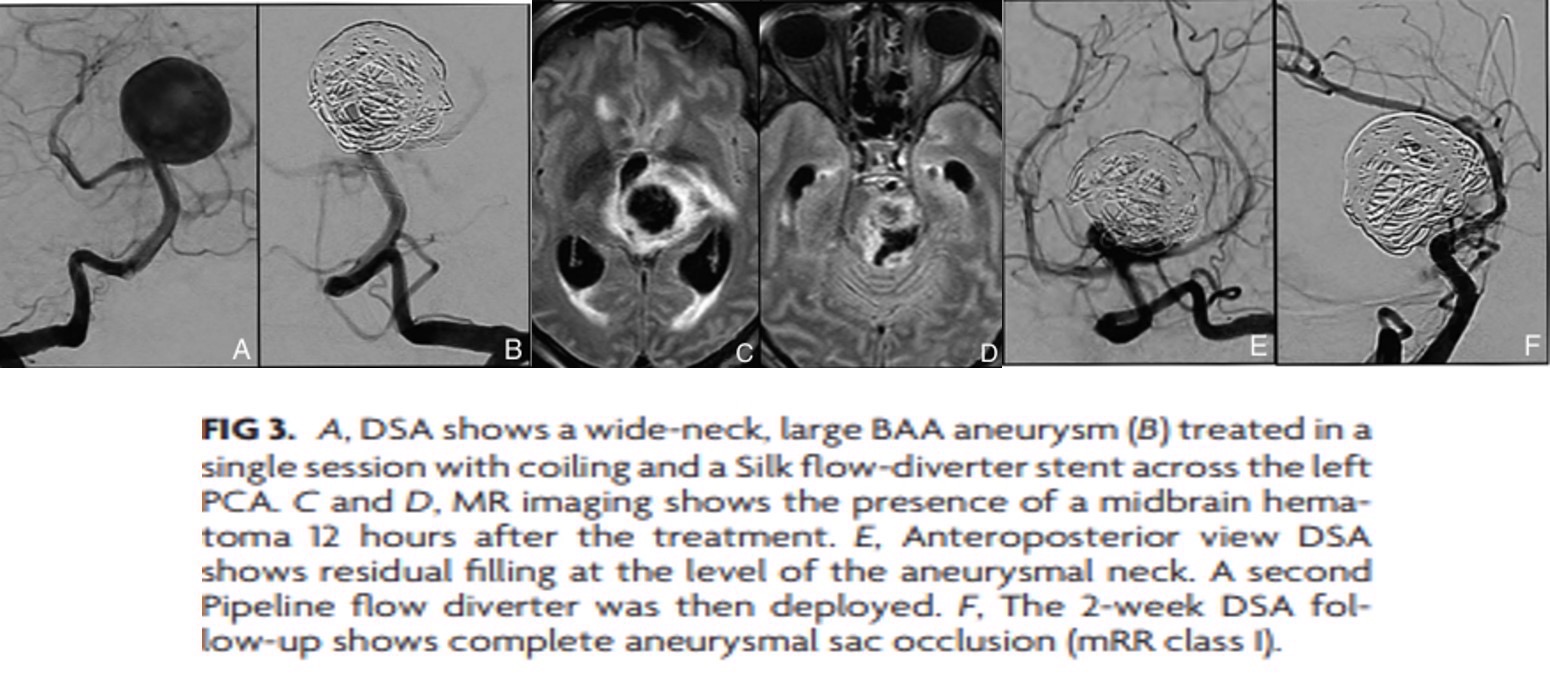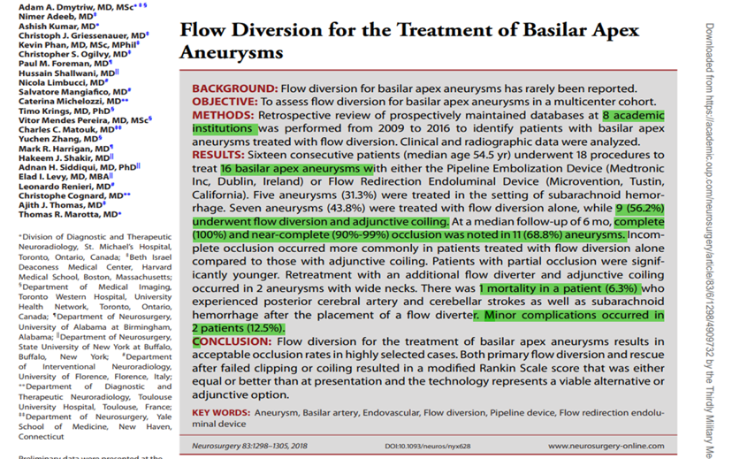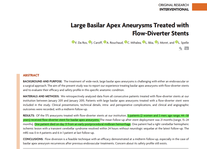 这是一篇迄今最多病例血流导向装置治疗基底动脉尖动脉瘤的多中心回顾性分析文献,随访时间较短(中位数6个月),68.8%的满意闭塞率,死亡1例(6.3%),为术后第四天动脉瘤迟发性出血;2例轻微并发症(12.5%):一例为动脉瘤周围水肿,一例为其他部位颅内出血。令人惊奇的是,这组病例中,竟没有一例发生穿支梗塞(包括无症状性梗塞)!这个结果,给我们带来了不小的信心。