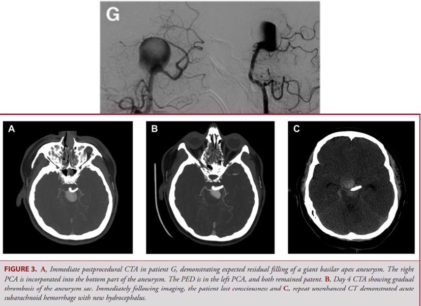 而唯一1例一期silkFD结合弹簧圈栓塞的病例,12小时后发生动脉瘤破裂导致中脑出血和脑室出血并发急性梗阻性脑积水,DSA显示瘤体内仍有造影剂充盈,再次套叠植入一枚pipeline,并行脑室外引流,两周后复查DSA显示动脉瘤完全闭塞,但患者术后31天死于重症肺炎引起的低氧血症。
