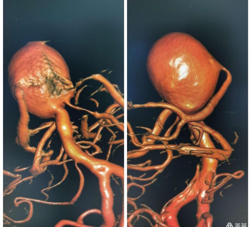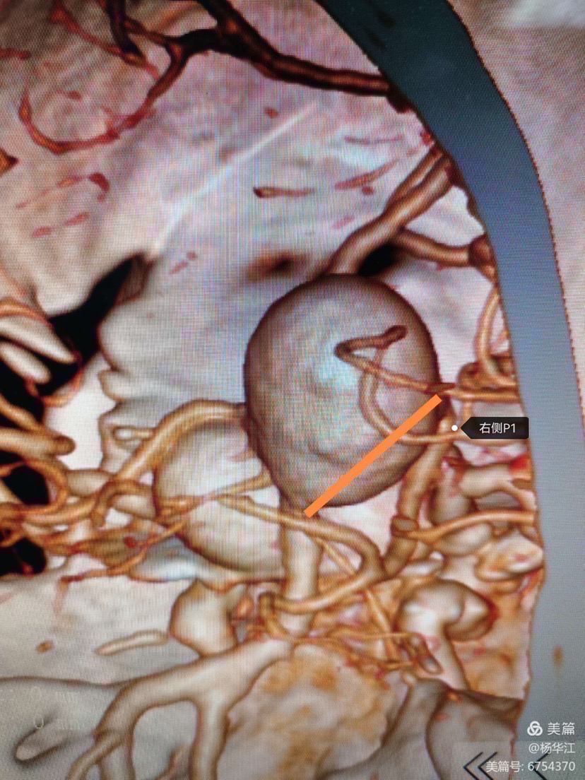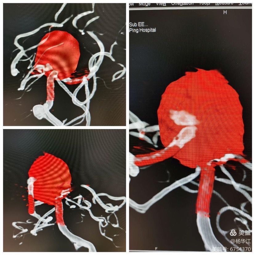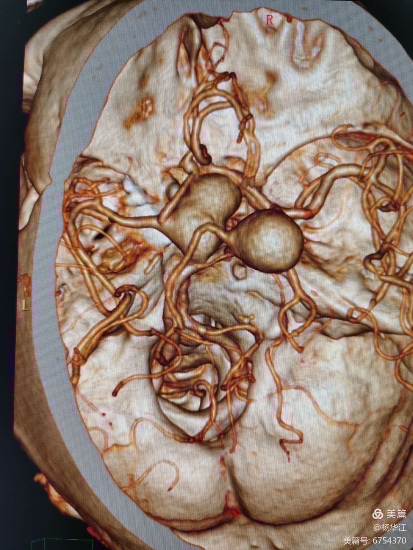 患者女性 ,65岁,20年前后交通动脉瘤出血,开颅夹闭(影像资料已查不到),近期间断头昏头疼,检查发现颅内多发巨大动脉瘤,收入院。神经系统查体无异常。