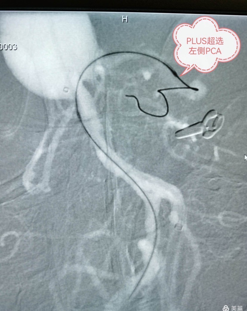 双侧股动脉穿刺,左侧椎动脉置入6F长鞘+5Fnavien,右侧椎动脉置入6F Enoy导管,选取第一个工作位,准备超选右侧大脑后动脉。
