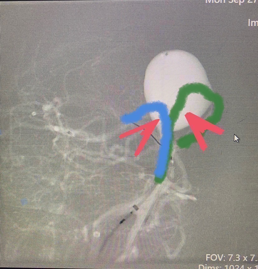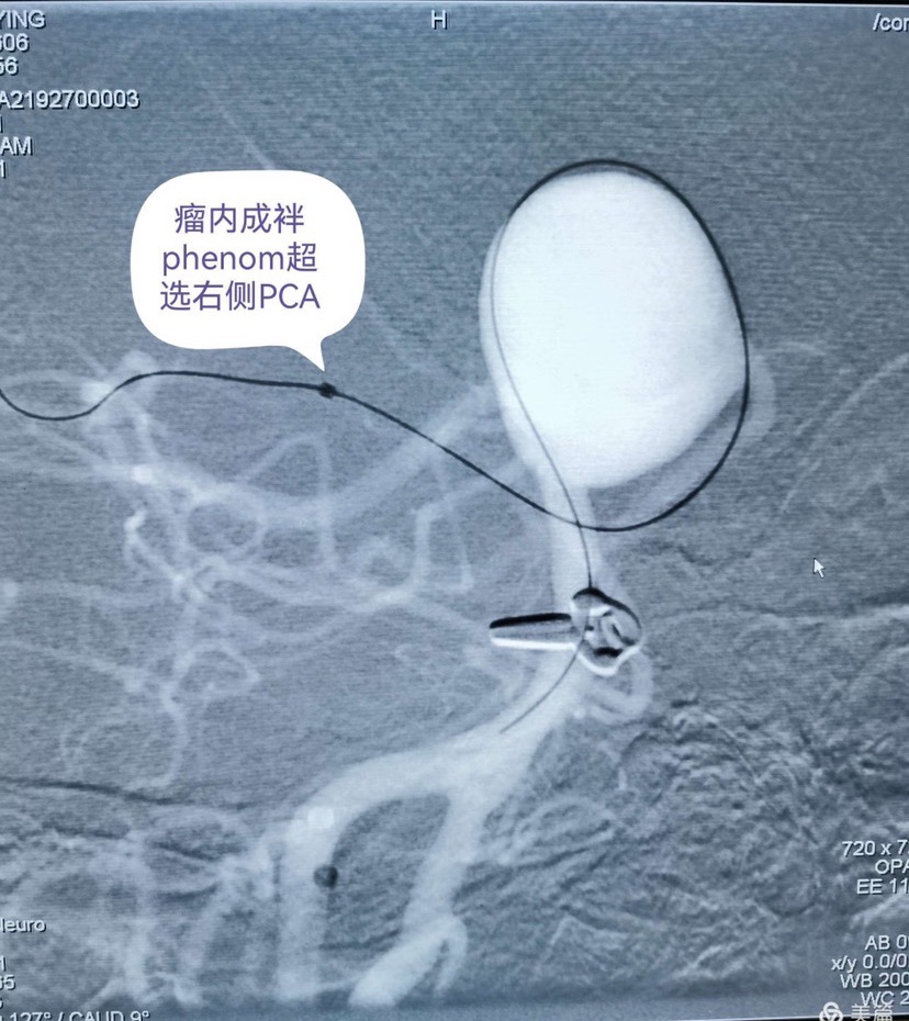 先echelon10微导管瘤内成襻技术超选入右侧大脑后动脉远端,拉直解襻微导管,交换phenom导管到右侧大脑后动脉远端,由于瘤颈超宽,导管再次疝入成襻才能超选至右侧大脑后动脉远端。