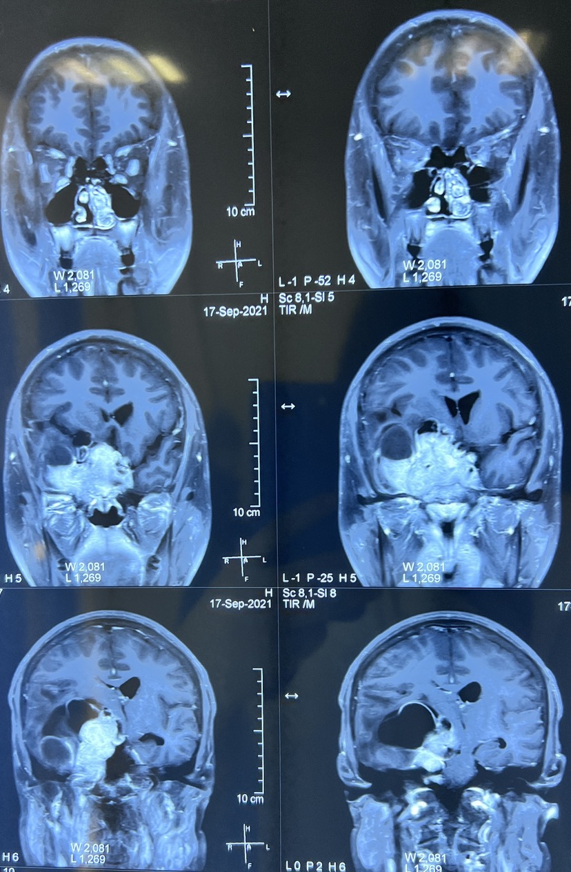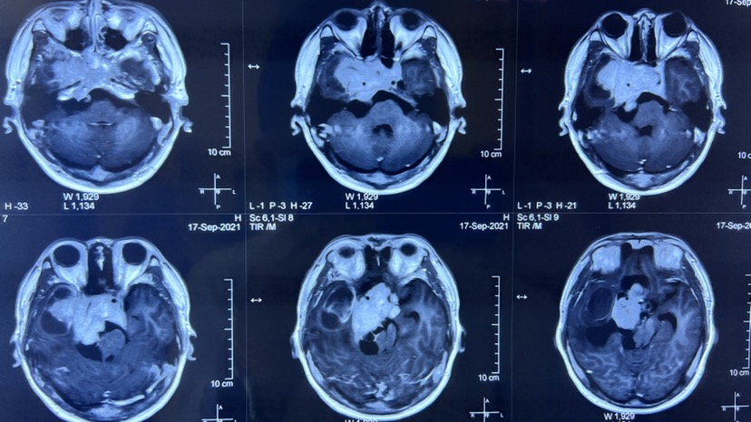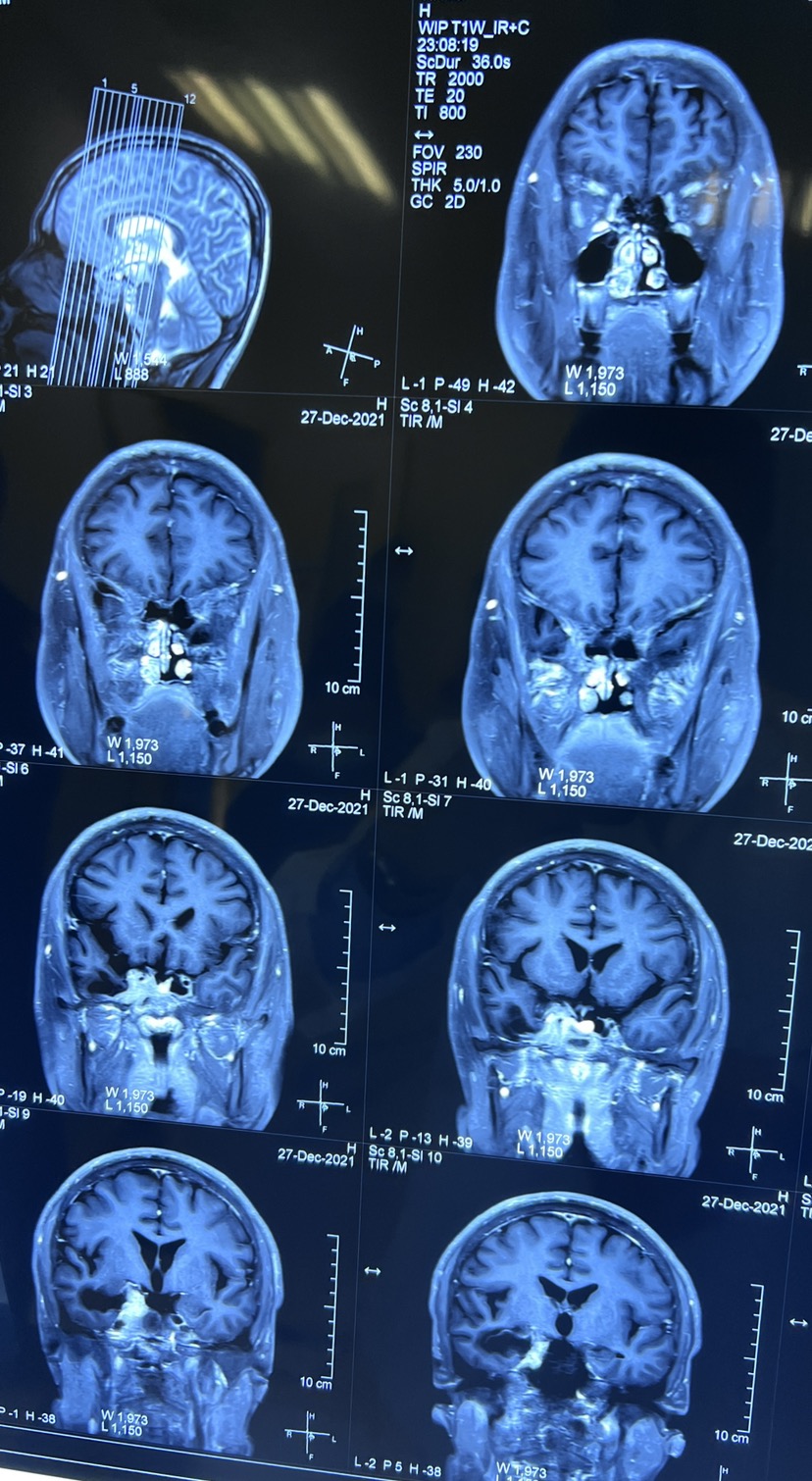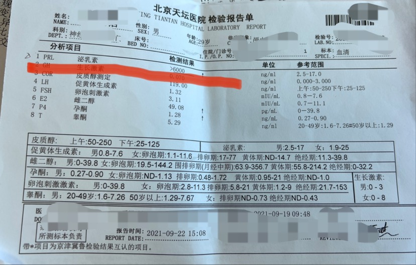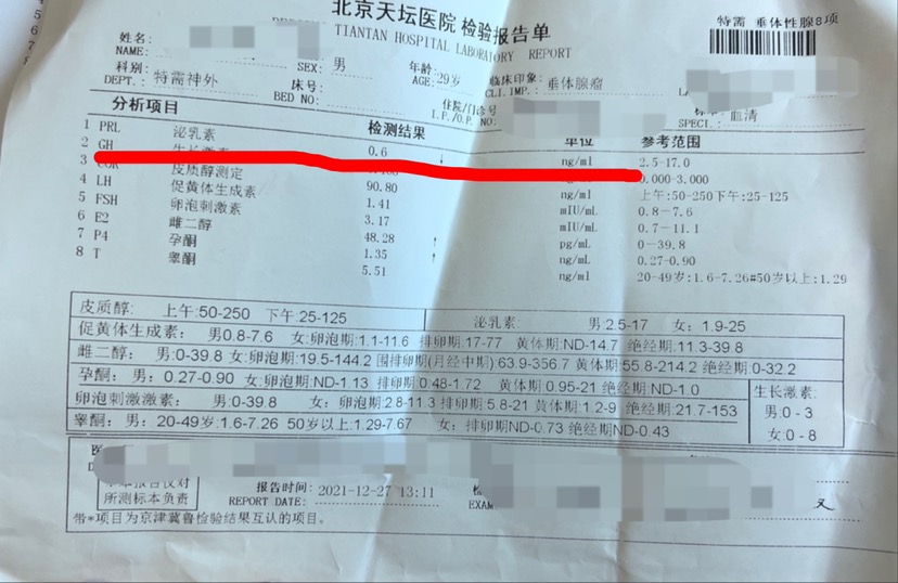 患者男性39岁以头疼视力下降,来门诊的检查。发现鞍上向脑内发展的巨大的侵袭性垂体瘤,泌乳素大于6000,根据术前的检查,该患者为泌乳素型垂体瘤,因此建议先口服溴隐亭药物治疗。 口服溴隐亭药物治疗3个月后 药物治疗后3个月复查核磁共振,发现肿瘤奇迹般的缩小,病人的一般状况也非常好。 用药前泌乳素 用药后泌乳素 病人情况 药物治疗泌乳素型垂体瘤,即溴隐亭用药一定要规范,用药之后肿瘤可以明显缩小。提示这样的病例药物治疗优于手术。