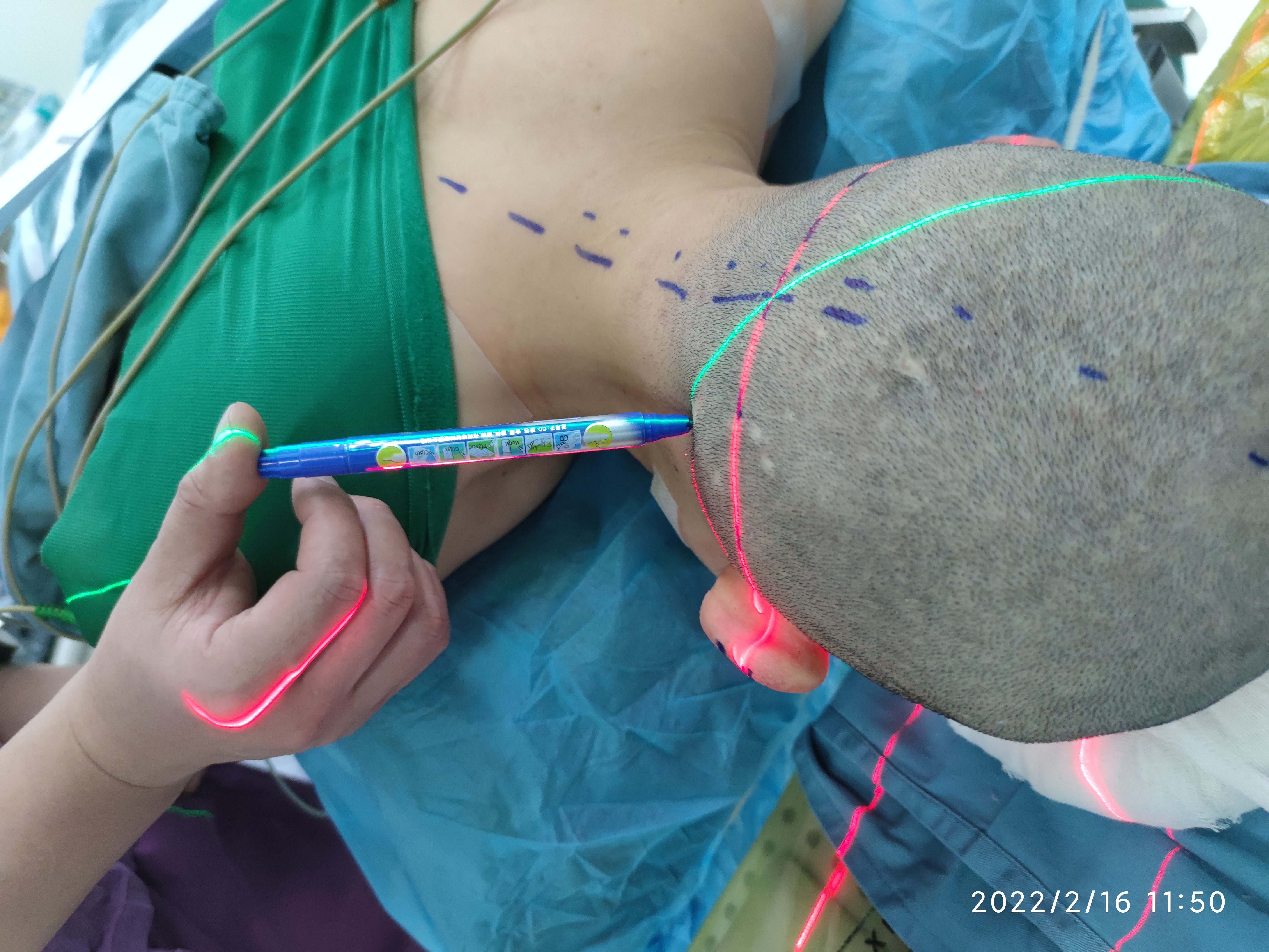 俯卧位安装激光框架,笔提示枕下穿刺点到靶点方向