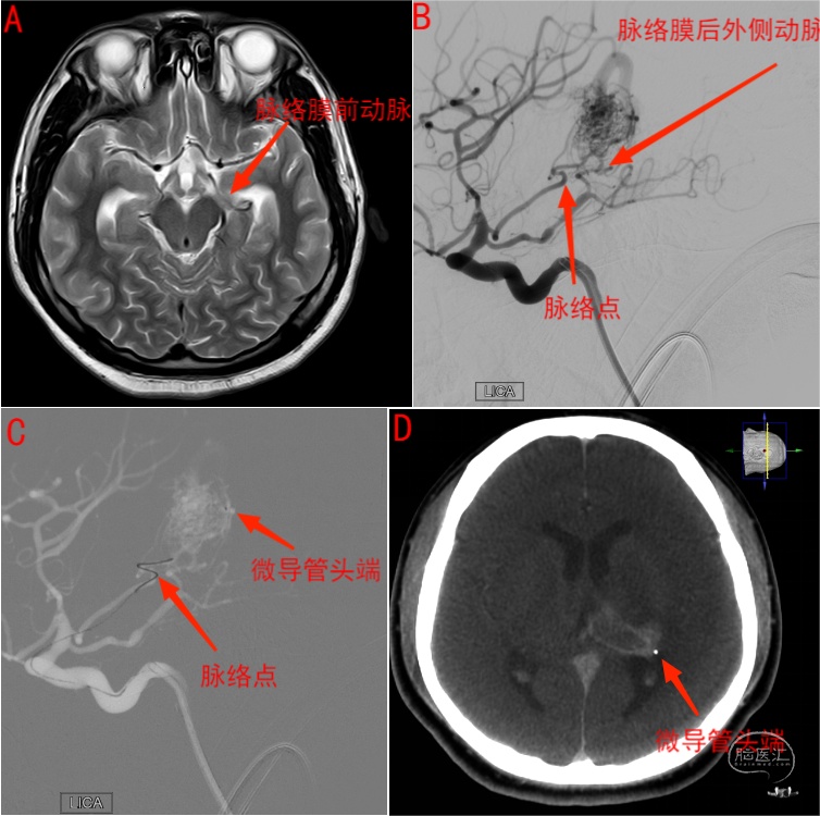 图15 左侧丘脑动静脉畸形伴出血患者。术前核磁T2像(A)显示左侧脉络膜前动脉增粗,左侧颈内动脉斜位造影(B)显示动静脉畸形由左侧脉络膜前动脉及脉络膜后外侧动脉供血,脉络点如图中所示。C显示术中微导管在微导丝支撑下越过脉络点并接近畸形团。D为术中XperCT证实微导管头端位于出血动静脉畸形团后外侧。