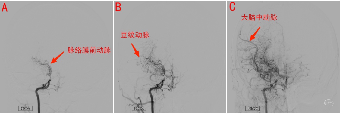 在胚胎发育早期,脉络膜前动脉是大脑主要的供血来源之一。随着发育,椎基底动脉系统形成大脑后动脉并逐步替代脉络膜前动脉的部分供血区域,与此同时,脉络膜前动脉供血区域减少。因此,如果发育期发生变异,脉络膜前动脉可向大脑后动脉供血区域供血,此时增粗的脉络膜前动脉有可能被误认为后交通动脉-大脑后动脉或胚胎型大脑后动脉。