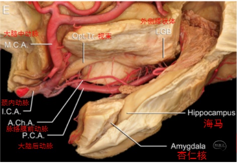图6 外侧观。离断颞干并牵开颞叶后从外侧显露脉络膜前动脉,可见脉络膜前动脉环池段向前穿质、视束、大脑脚、外侧膝状体和颞叶内侧发出供血分支。