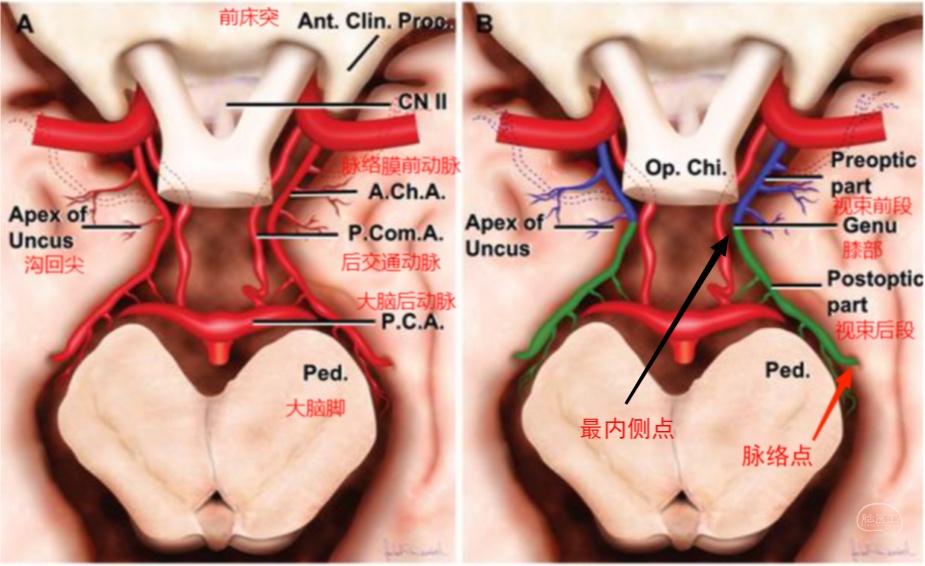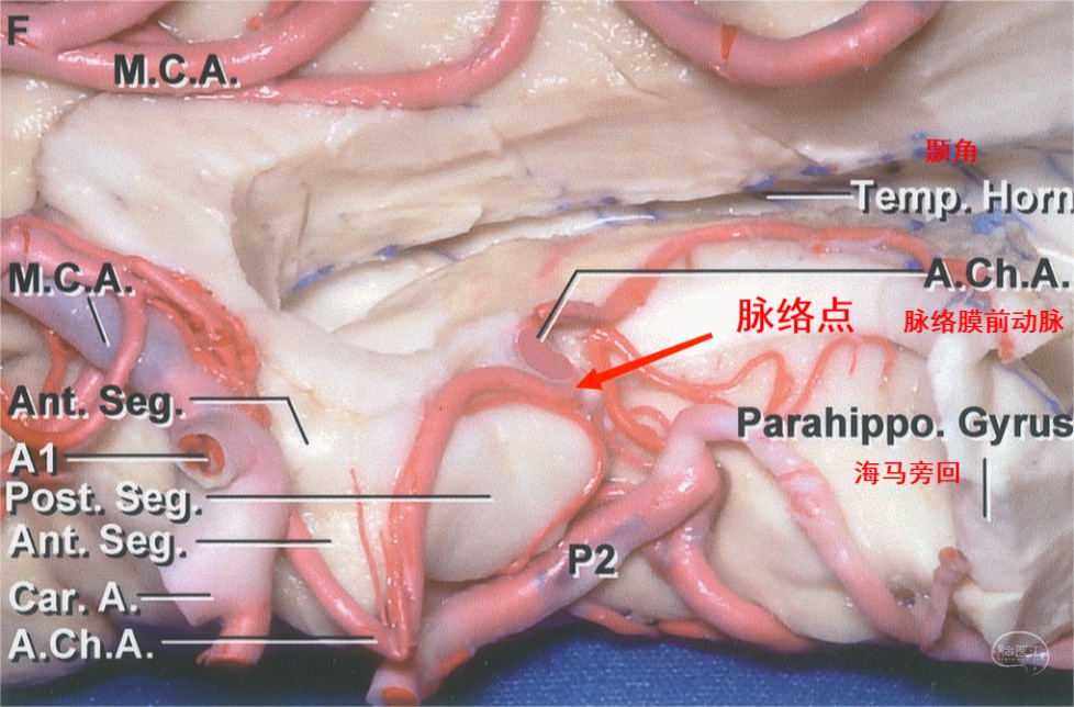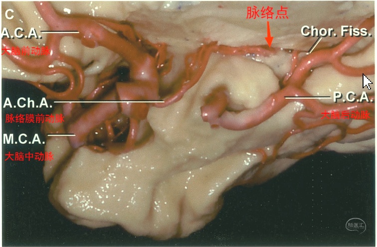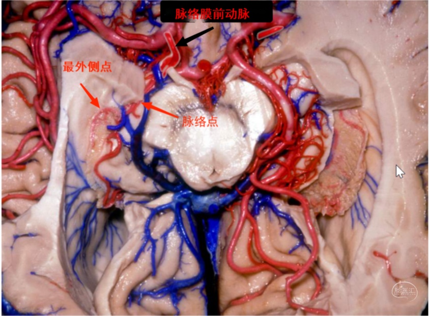 脉络膜前动脉自颈内动脉床突上段后壁发出,发出位置位于后交通动脉发出点与颈内动脉分叉部之间,以脉络点(Plexal point)为界分为脑池段和脉络丛段。脉络点为脉络膜前动脉进入脉络裂的部位,在Rhoton解剖中又称为下脉络点(inferior choroidal point)。如何理解和识别脉络点呢?且看以下分解。