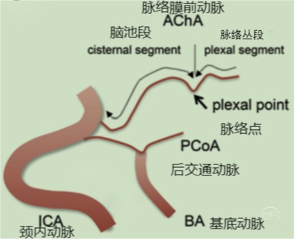 图1 脉络膜前动脉侧位示意图 脉络膜前动脉以脉络点(Plexal point)为界分为脑池段和脉络丛段,其中脑池段在侧位上为S形。