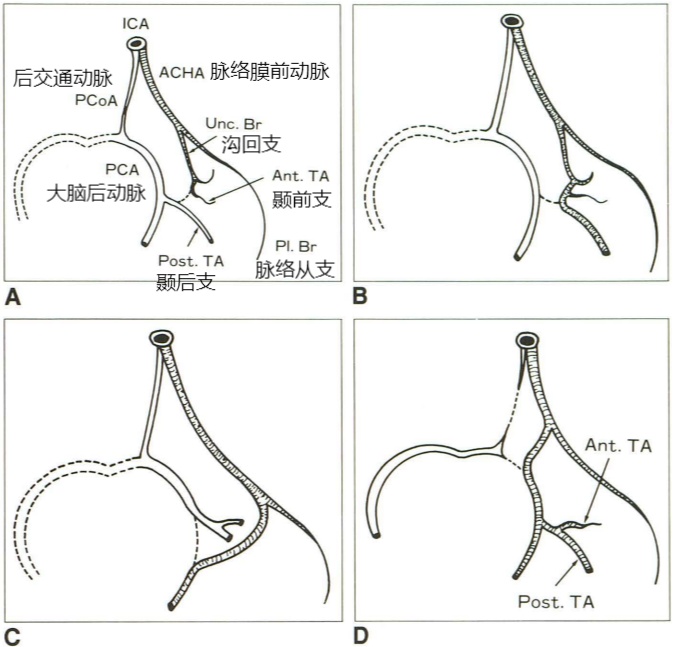 图11 脉络膜前动脉(AChA)变异类型示意图。