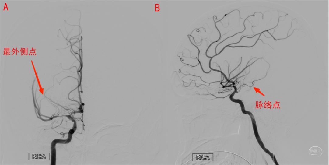 图12 右侧颈内动脉正位(A)及侧位(B)造影,由于大脑中动脉M1段狭窄,其对脉络膜前动脉的阻挡减少,从而使此例管径相对较粗的脉络膜前动脉显示更清晰。最外侧点易于在正位识别,脉络点易于在侧位识别。