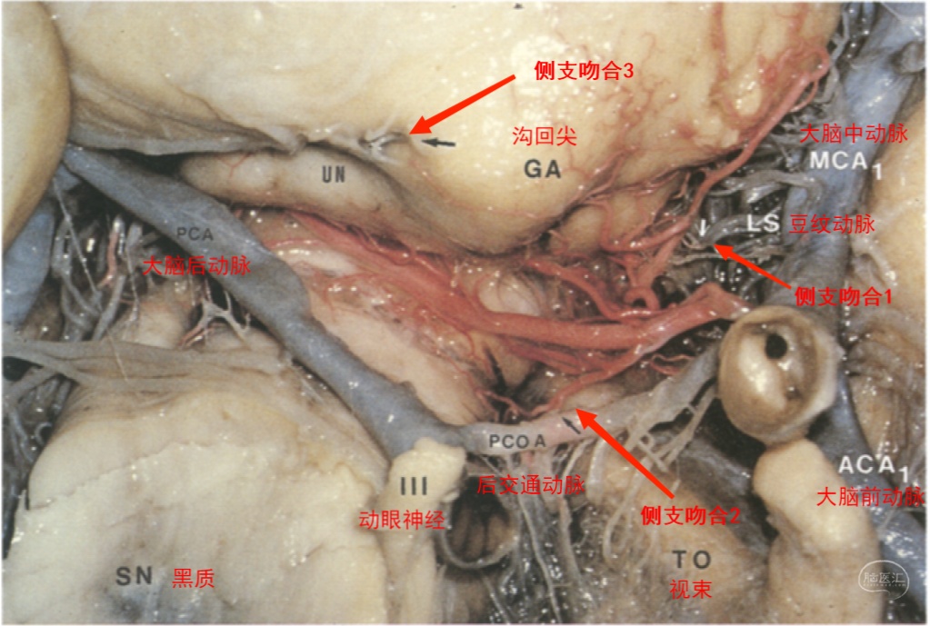 图10 右侧大脑半球下面观,通过对脉络膜前动脉的染色显示其与周围血管的侧支吻合。侧支吻合1显示与豆纹动脉的吻合,侧支吻合2显示与后交通动脉的吻合,侧枝吻合3显示与大脑后动脉沟回支的吻合。
