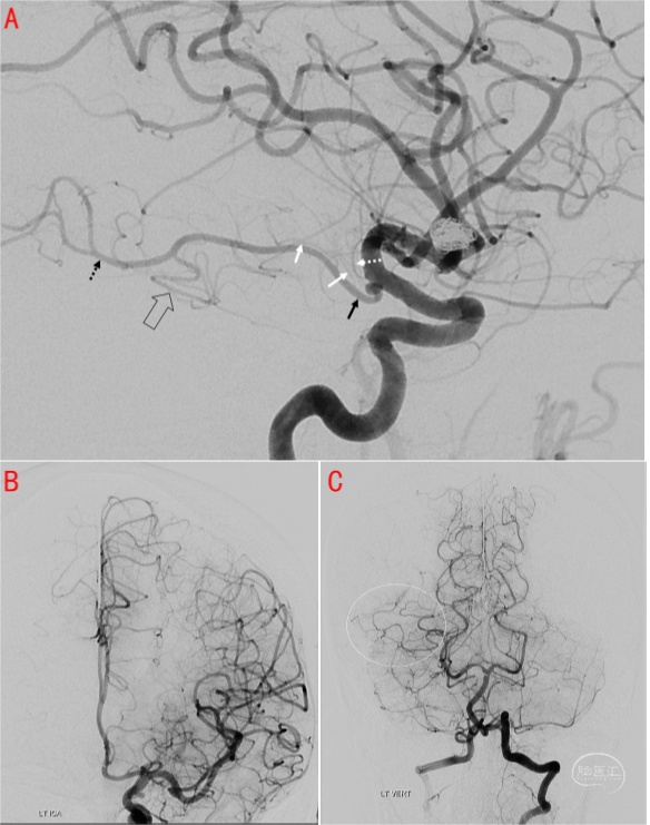 图14 脉络膜前动脉(AChA)变异类型2-异常颞下动脉合并动脉瘤。A左侧颈内动脉侧位造影,可见脉络膜前动脉(黑箭)增粗并发出颞下中支(空箭)和颞下后支(虚黑箭),同时可见主干发出多个穿支(白箭),颈内动脉末端发出穿支(虚箭)进入前穿质而非脉络膜前动脉。B左侧颈内动脉正位造影见左侧大脑后动脉未显影;C 左侧椎动脉正位造影,与右侧大脑后动脉对比可见左侧大脑后动脉颞下支未显影。该例左侧脉络膜前动脉动脉瘤很容易被认为是后交通动脉动脉瘤,如果结合左侧大脑后动脉P1段存在想当然的认为栓塞动脉瘤可闭塞该血管,那么可能造成严重的并发症。