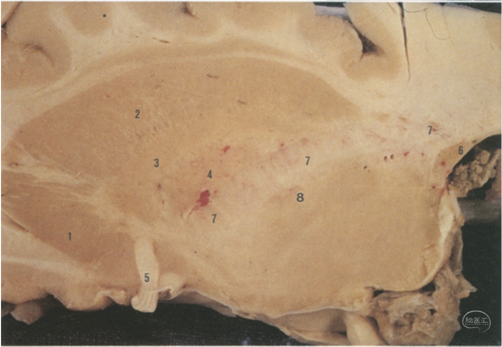 图8 前联合层面断层解剖图,图中点片状红染为脉络膜前动脉供血区域。1 尾状核头;2 壳核;3 苍白球外侧部;4苍白球内侧部;5 前联合; 6外侧膝状体;7 内囊后支;8 丘脑。