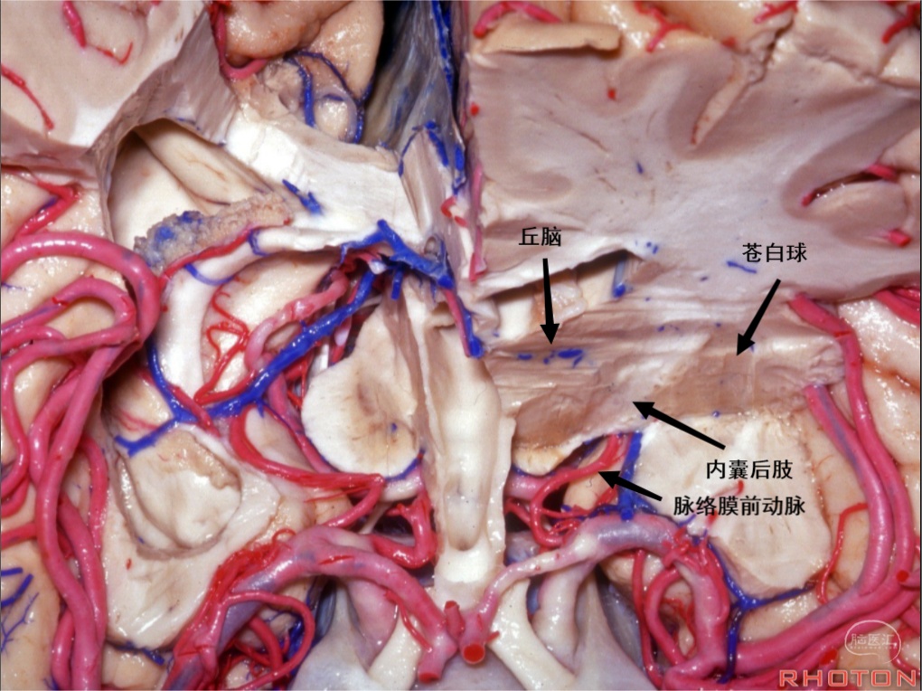 图7 前上观。脉络膜前动脉脑池段后部走形在大脑脚池顶端,大脑脚池上壁可见丘脑、内囊后支和苍白球。脉络膜前动脉发出穿支供应丘脑外侧部、内囊后支和苍白球内侧部。
