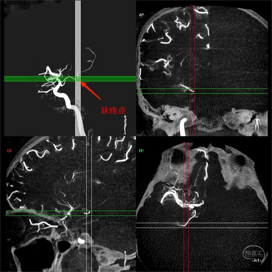 图13 同一例患者右侧颈内动脉3D成像(图中为侧位),经过Xper CT冠状位、矢状位及轴位MIP图像证实脉络点的位置。