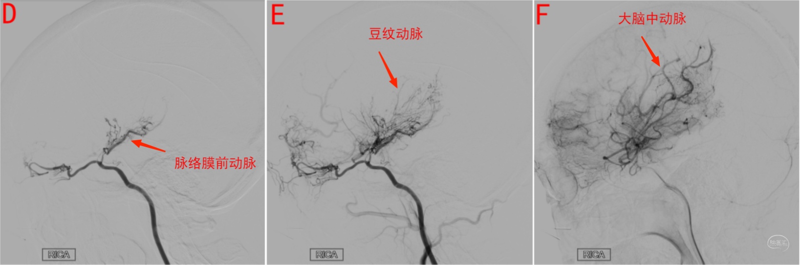 图17 烟雾病患者右侧颈内动脉侧位造影早(D)、中(E)、晚(F)期,显示颈内动脉末端纤细,大脑前动脉及大脑中动脉闭塞,脉络膜前动脉经表面丰富的穿支血管网向豆纹动脉代偿供血,然后豆纹动脉经侧支吻合向大脑中动脉代偿供血。