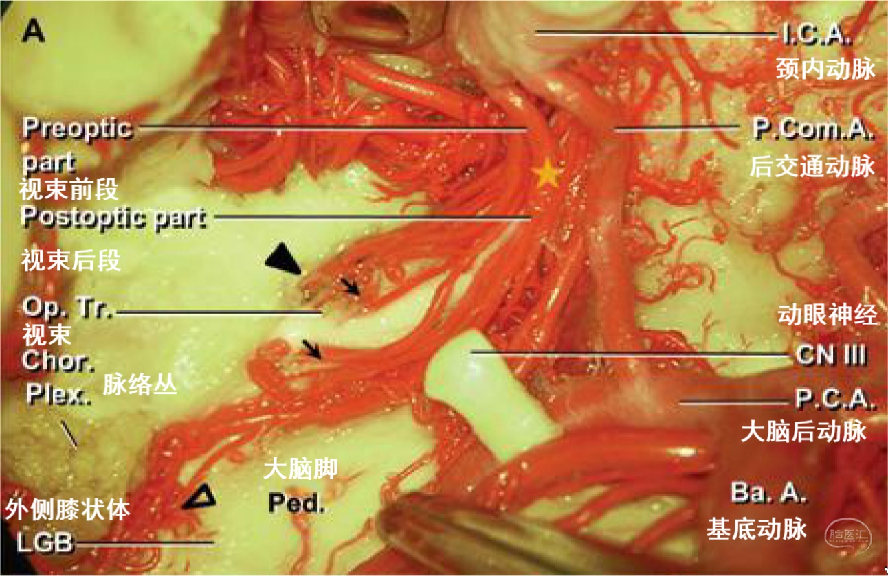 图9 右侧脉络膜前动脉下面观 脑池段主要发出供应颞叶内侧结构的分支和供应脑深部结构的穿支。图中星号为最内侧点,脑池段以此分为视束前段和视束后段。视束前段发出分支供应沟回前段和沟回尖端,发出穿支供应视束(上方黑箭)和经前穿质供应脑深部结构(黑色实箭头)。视束后段发出分支供应沟回后段,发出穿支供应视束(下方黑箭)、大脑脚、