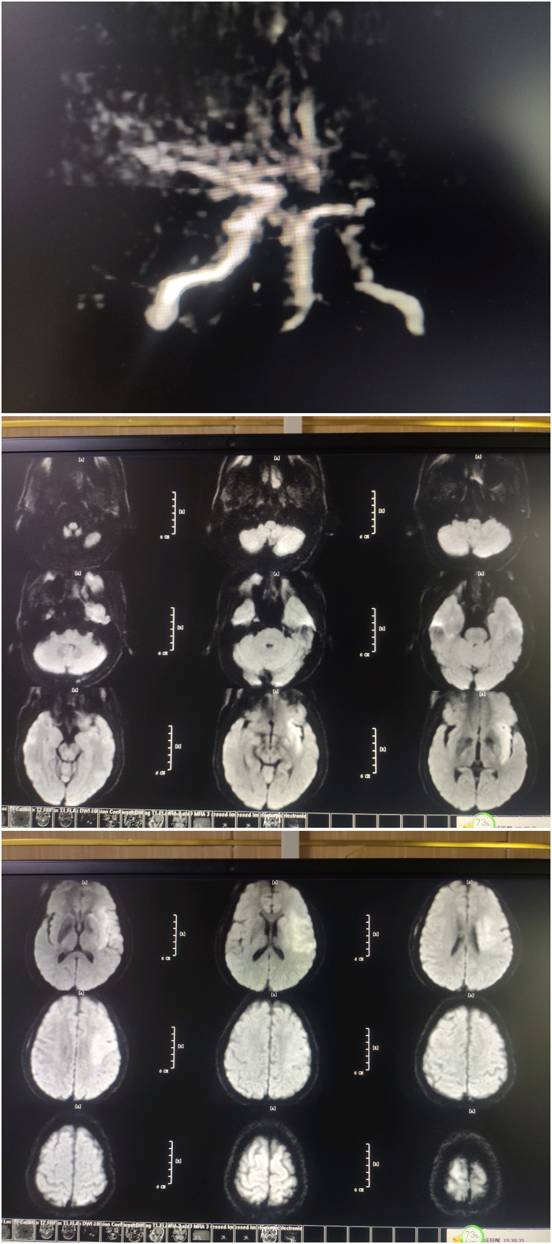 MRA提示:左侧颈内动脉末端及左侧大脑中动脉未见显影。DWI提示左侧大脑中动脉供血区高信号。DWI-Aspect评分:4分。醒后卒中,DWI信号不高,考虑存在大体积缺血半暗带,急诊血管内治疗。