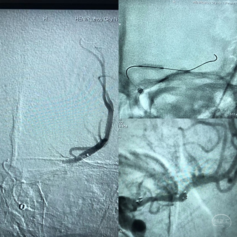 送入300mmSynchro微导丝,Gateway2.5*9mm球囊扩张后,观察血流,出现弹性回缩。再次扩张后,撤出球囊,交换PLUS导管,送入Enterprise4.0*23mm支架,顺利释放,血流维持可,轻度残余狭窄。
