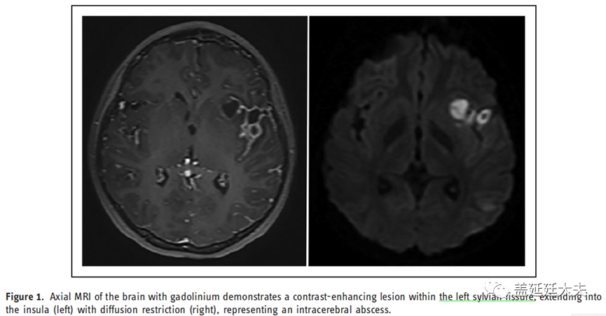 患儿10岁,女,主诉”头痛、嗜睡和发烧7天“。头颅MRI示左侧外侧裂、岛叶周围脓肿,感染源为副鼻窦炎(图1)。患儿接受广谱抗生素治疗,并接受两次内窥镜鼻窦手术和两次立体定向脓肿引流手术。细菌培养显示金黄色葡萄球菌和链球菌的生长。在住院的第18天,她突发左侧脑实质内出血伴小脑幕切迹疝,遂行急诊血肿清除和左侧颅骨去骨瓣减压术。