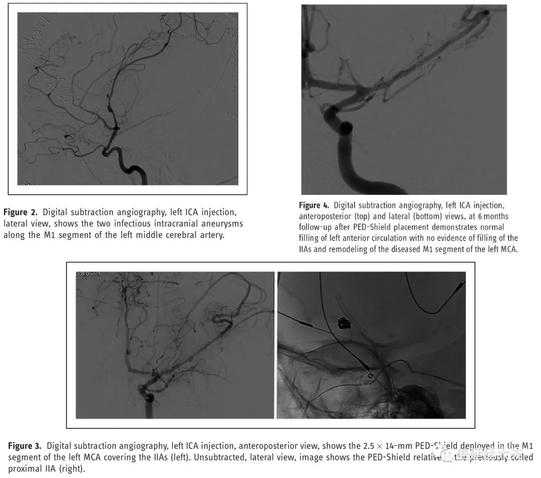 术后CTA发现左侧MCA动脉瘤累及M1段。进一步行DSA示左侧M1段的2个感染性脑动脉(图2),远端动脉瘤大小为1.6*0.9mm,近端动脉瘤大小为4.05*4.28mm。近端动脉瘤行急诊弹簧圈栓塞术。随后将导管置入脓肿腔行抗生素冲洗。拔除脓肿腔引流管后,她开始每天服用325mg阿司匹林和37.5mg氯吡格雷。5天后转入神经介入中心行感染性脑动脉瘤PED栓塞术。左侧MCA近端颞前动脉以远动脉管径1.51mm,病变以远M2分支主干动脉管径1.59mm,两点之间距离大约17.3mm,在目标位置植入2.5*14mm PED-Shield一枚,避开颞前动脉开口(图3)。术后MRI及造影显示无血栓栓塞等并发症。术后继续口服抗生素6周,及双联抗血小板药物。复查MRI显示颅内感染情况好转,颅内动脉瘤未见显影,无其它梗塞事件。术后4个月MRI显示颅内感染治愈,6个月造影示血管重构未见动脉瘤复发(图4)。