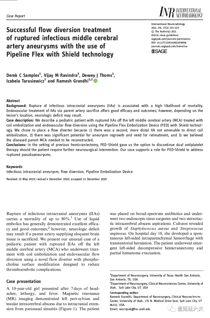感染性动脉瘤目前尚没有统一的标准化治疗。小型未破裂感染性动脉瘤,如果血管造影随访瘤体未见生长,可以先用抗生素治疗。手术或血管内介入治疗时需要着重考虑动脉瘤破裂状态、颅内血肿、功能区等问题。由于感染性动脉瘤就像假性动脉瘤一样形态不规则、易碎性和载瘤动脉微结构的破坏,外科手术治疗充满挑战。我们在动脉瘤累及功能区时考虑开放性手术,必须注意术中动脉瘤和血管操作时可能导致灾难性出血。由于病人接受了多次手术,这都增加蛛网膜下腔的粘连,组织变得更加脆弱易碎。血管内治疗是更受欢迎的治疗方式,通过闭塞载瘤动脉而不是直接动脉瘤栓塞。受累动脉所供应皮层区域的功能在闭塞载瘤动脉是需要特别关注。尽管缺乏有效证据,支架辅助弹簧圈栓塞或单独支架置入治疗感染动脉瘤已经被有效的应用于感染性动脉瘤的治疗。血流导向装置治疗囊状动脉瘤已被证明安全有效,但少有报道用于感染性脑动脉瘤。Appleboom等首次报道应用血流导向装置治疗抗生素应用后仍增大的右侧颈内动脉海绵窦段大动脉瘤。Kobets等报道应用套叠PED治疗1例颈内动脉海绵窦段大的感染动脉瘤,患者临床症状改善,随访造影动脉瘤闭塞。血流导向装置治疗的关键优势在于保留载瘤动脉和支架内形成“新内膜”。尽管目前还没有支架相关感染的报道,但在使用植入式技术治疗感染性疾病时,这是一个重要的考虑因素。此外,双重抗血小板治疗的必要性、病变延迟破裂的可能性和血栓栓塞并发症是重要的注意事项。对支架固有致栓性的关注促进了磷酸胆碱涂层PED的问世,利用磷酸胆碱表面修饰,降低血栓形成可能,加快内皮细胞的生长。在一项未破裂颅内动脉瘤的前瞻性多中心临床试验治疗中已经证明了该技术的短期安全性。Girdhar等人在体外人体流动模型中分析血流导向装置Pipeline flex、Pipeline shield和FRED的致栓性,并证明Pipeline shield 比其他装置产生凝血酶-抗凝血酶复合物和β-血栓球蛋白水平更低。Lenz Habijan等研究了两种亲水性聚合物涂层,并证明与无涂层相比,镍钛表面上的血小板粘附显著减少。Martinez Moreno等证实在犬模型中,抗血栓亲水性涂层具有生物相容性而无急性炎症现象。该报道是首次用Pipeline shield应用于治疗儿童感染性脑动脉瘤,结果证实PED-Shield装置可以用于破裂假动脉瘤。但目前缺乏抗血小板药物对儿童终生用药的影响,需要进一步研究证实。译者介绍