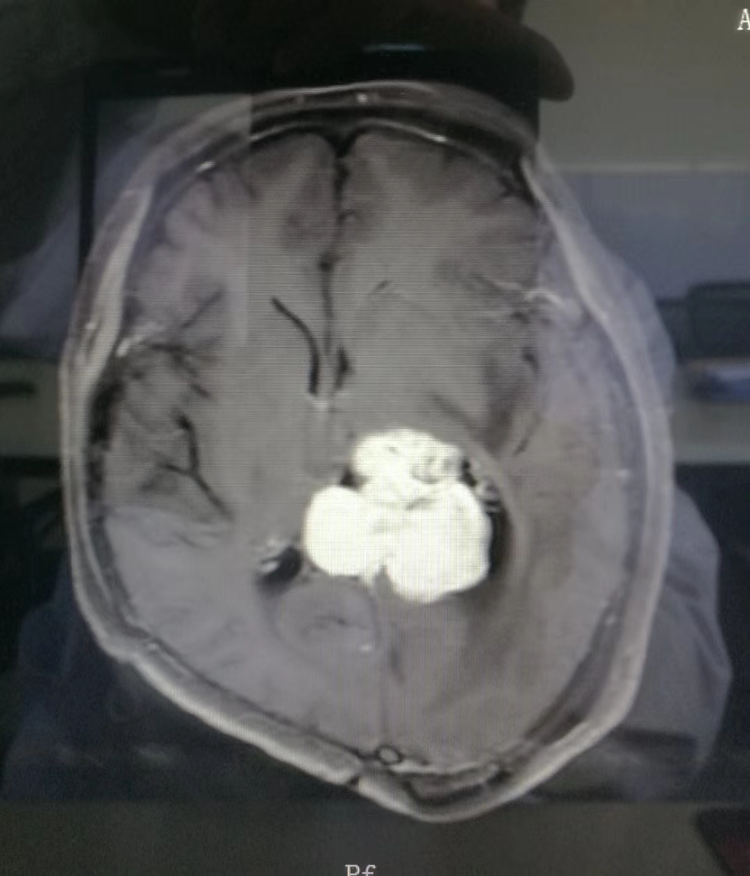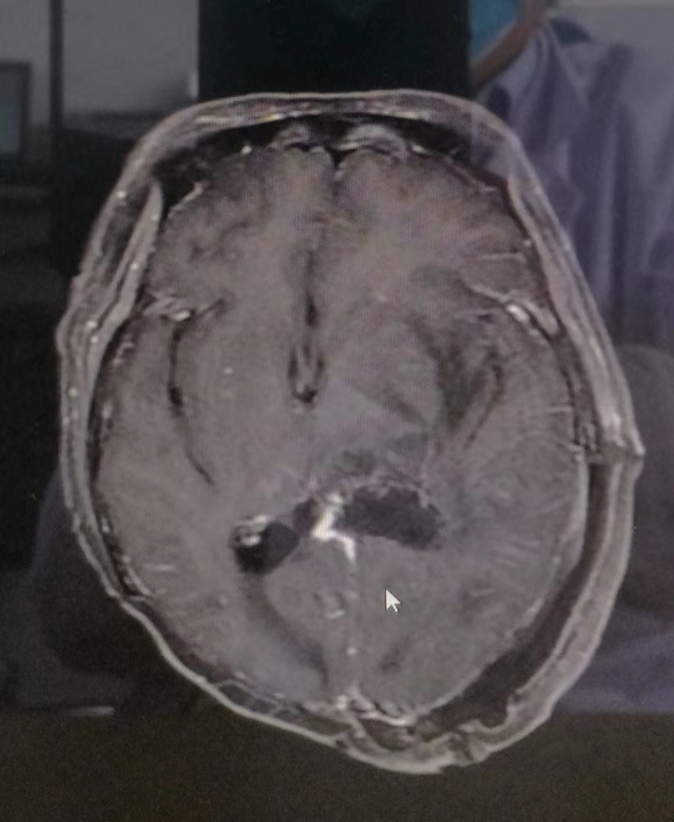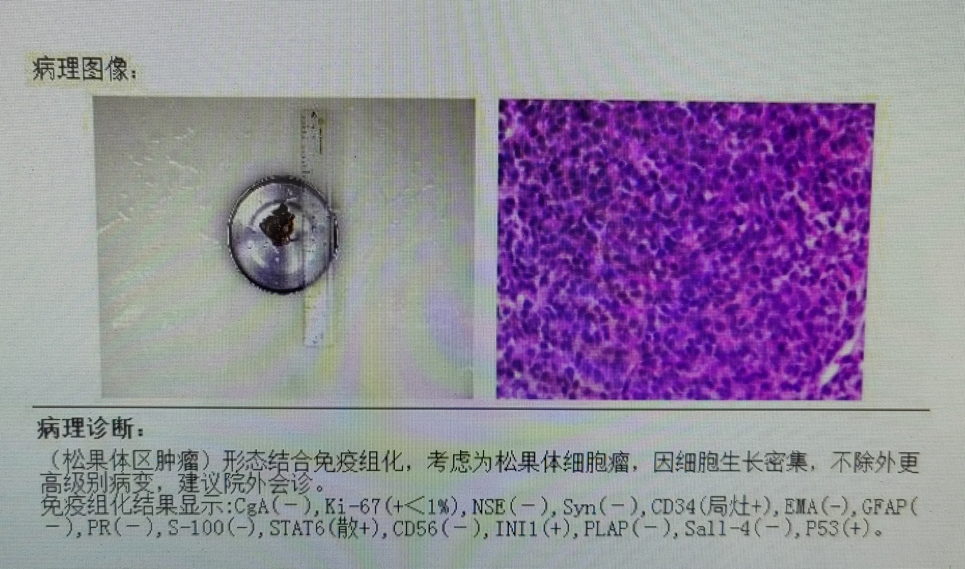 男,67岁,复发松果体细胞瘤。10年前外院手术病理1级!来院要求直接放疗,放疗后短时间内中线移位、昏迷,手术切除占位,意识好转! 术前MRI 术前MRI 术前MRI 术前CT 术后MRI 术后MRI 术后MRI 病检结果