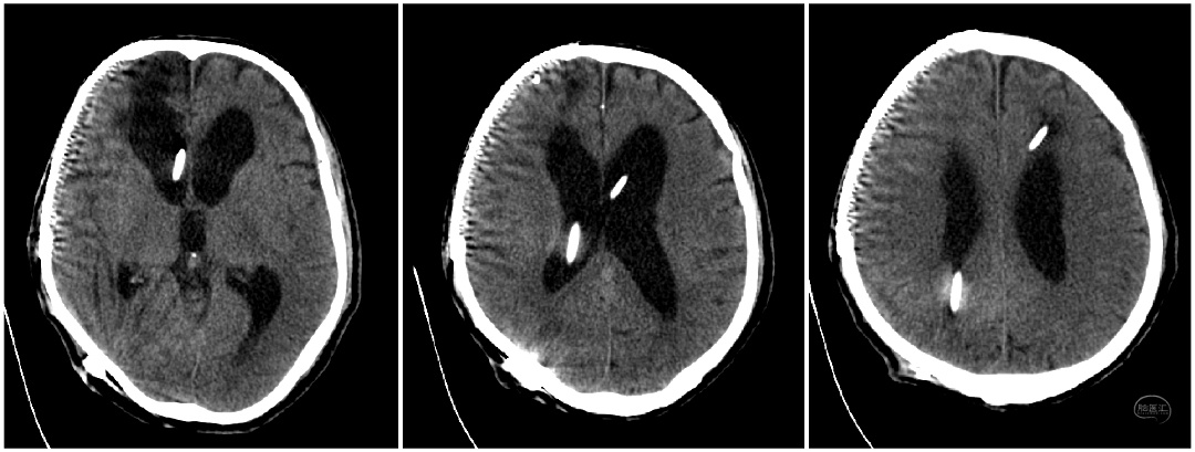 目前低颅压性脑积水的病理生理机制仍未明确,有学者提出黏弹性原理,在脑积水形成初始,脑室内脑脊液积聚使脑室内压力增大,使脑组织这个黏弹性体受力逐渐变形,脑室形态不断扩大,当扩大到一定程度后脑室内压力下降,类似施加在黏弹体上的压力被卸载,因黏弹体变形恢复存在滞后延迟效应,此时脑室内虽然已呈低压状态,但扩大变形的脑室未能同步恢复正常。目前研究主要倾向于LPH与脑顺应性的改变有关。对于确诊LPH的患者,除积极处理病因外,还可采用持续的脑室低压或负压外引流,其目的在于降低直至消除侧脑室-蛛网膜下腔的压力梯度差,逐渐恢复脑组织弹性,促进脑室形态和脑组织顺应性恢复正常。住院期间对该患者间断Ommaya囊抽取脑脊液1次/日,60-70ml/次,患者智力减退、步态不稳等症状无明显改善。后期调整Ommaya囊抽取脑脊液次数,改为2次/日,80-90ml/次。在增加脑脊液抽吸量及频次后,患者意识及智力减退症状逐渐好转,可逐步经口进食。