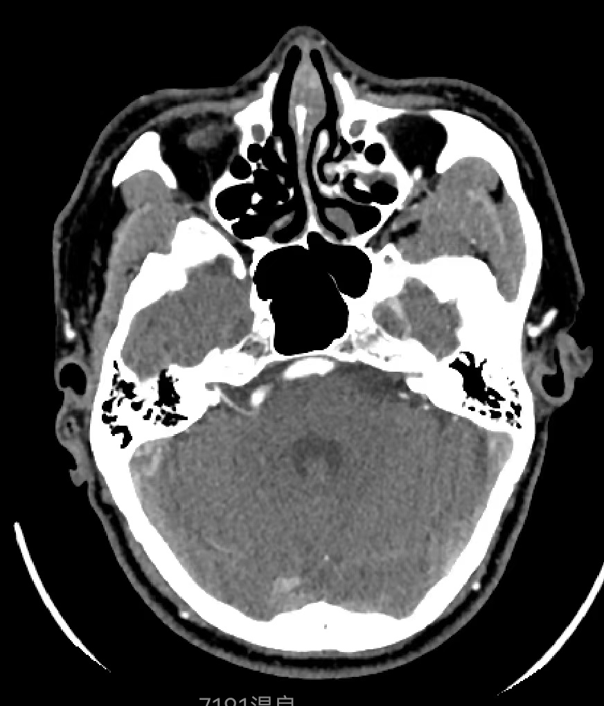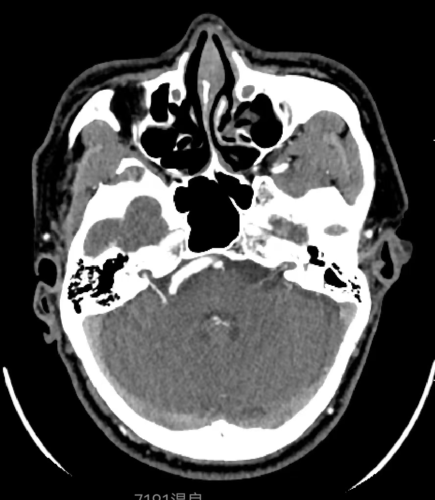 患者,男性,46岁,因“右侧面肌痉挛5年”就诊。查体右侧可见典型的面肌痉挛表现。当地医院MRI可见右侧椎动脉与面神经关系密切,我院行CTA检查可见内听道附近椎动脉扩张、迂曲,与面神经关系密切,与当地医院MRI相符。
