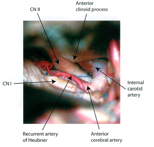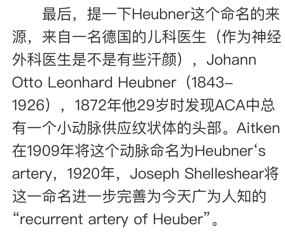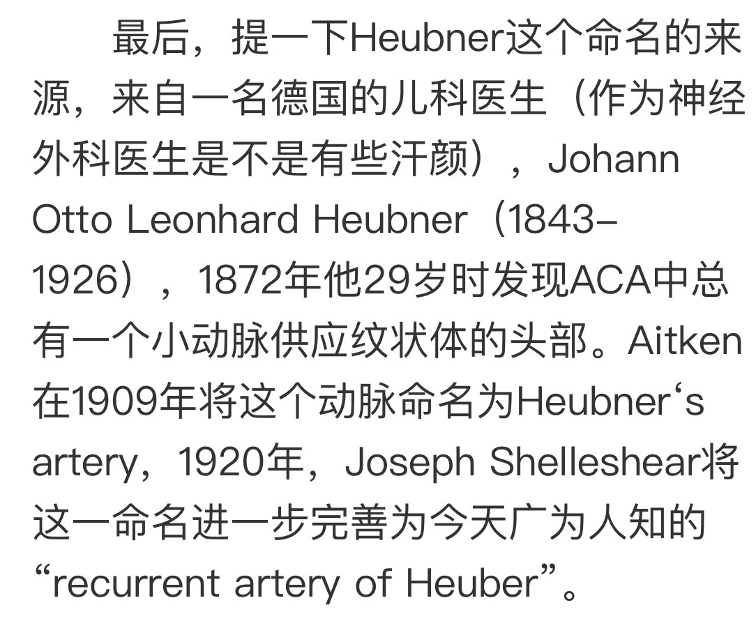 Heubner返动脉是由大脑前动脉A1末端发出的豆纹动脉,由于走形和A1段相反,故称Heubner返动脉,该动脉梗塞可能引起尾状核头梗塞,引起偏瘫和面瘫,便身震颤等症状。