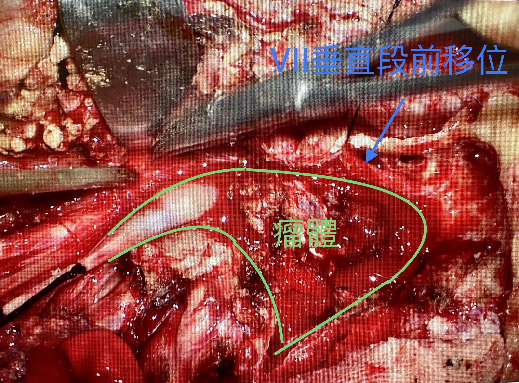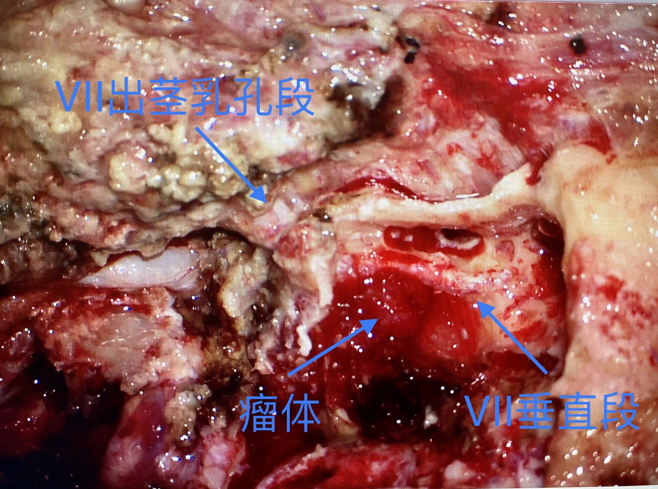 暴露面神经垂直段后可见肿瘤紧贴面神经并将其向后推挤,术中打开茎乳孔并做垂直段前移位