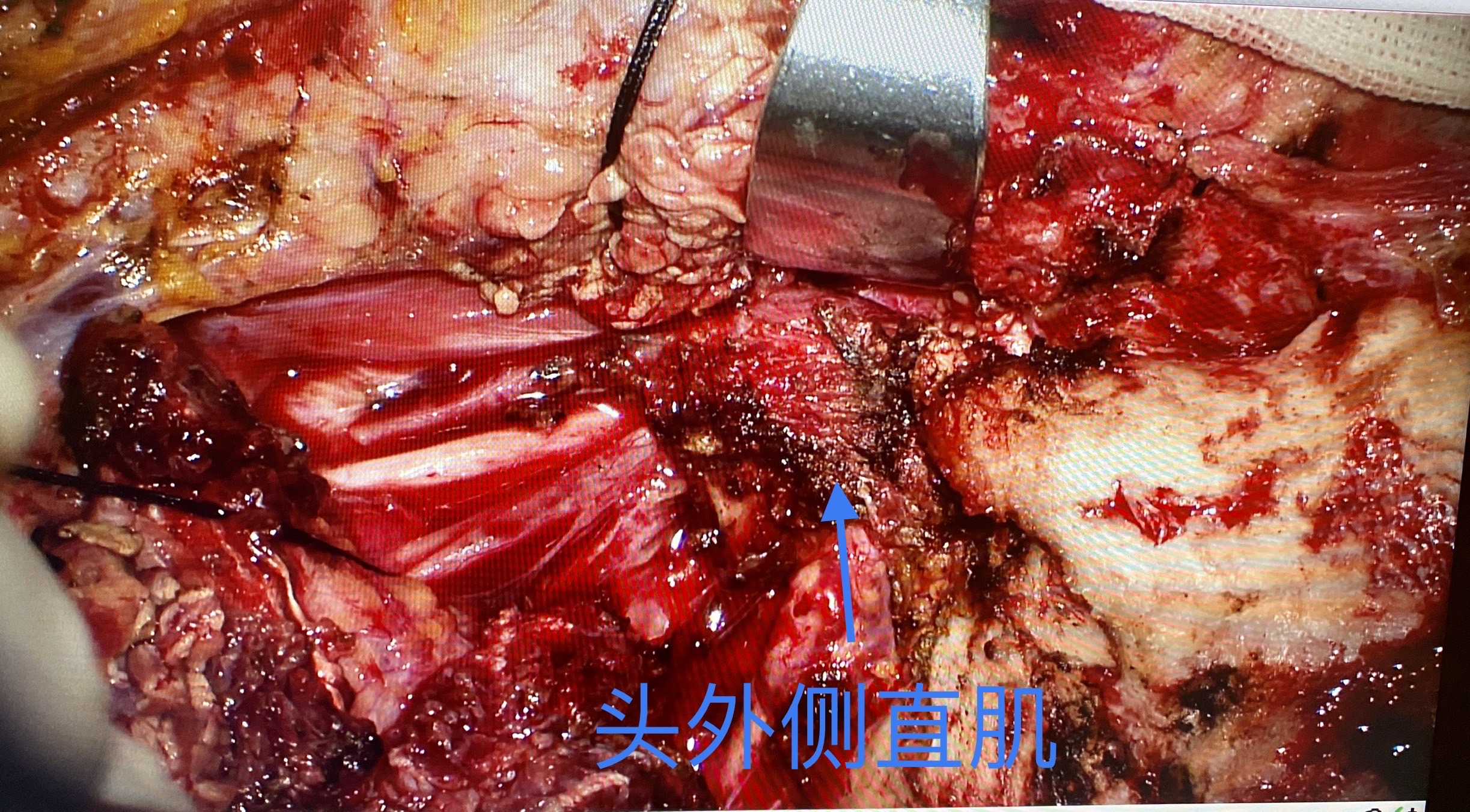 头外侧直肌附着于C-1横突前方和颈静脉突的位置,磨除C-1横突,乳突尖,并将头外侧直肌向下游离后即可暴露颈静脉突,将其磨开就能暴露颈静脉孔向颈部走行的肿瘤操作最狭窄区域。