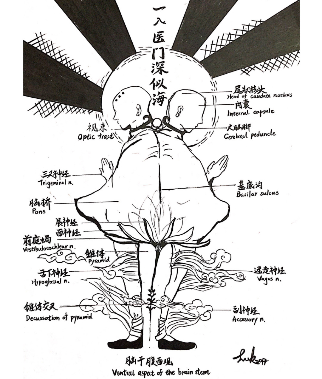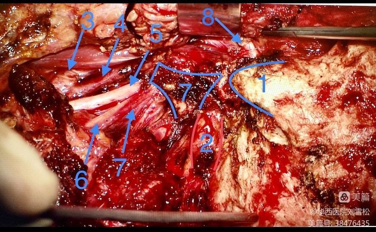 图中:1、乳突尖 2、椎动脉 3、颈内动脉 4、颈外动脉 5、迷走神经 6、副神经 7、颈内静脉 8、面神经 9、C-1横突
