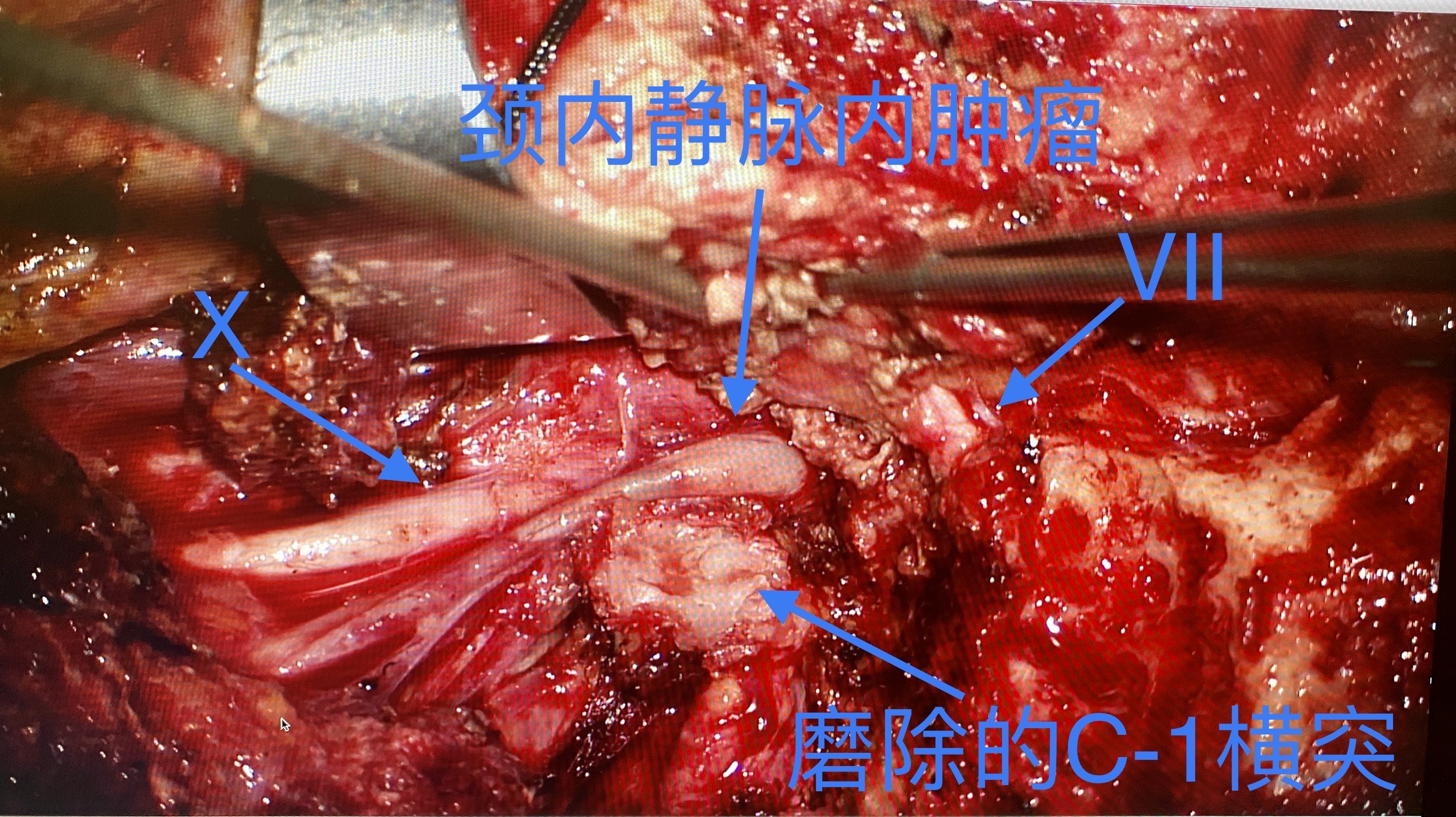 颈静脉孔区肿瘤是神经外科、耳鼻喉科和头颈外科的交界区病变。三国交界常常三不爱管。这个区域的鞘瘤和脑膜瘤可能还相对好做,但血供极其丰富的球瘤却有些麻烦,今天遇到一个中等大小球瘤,术前还是计划用神经外科的视角去处理这个病变,但为了能更好的暴露肿瘤边界以期整块切除控制出血。我们将乳突前方刚出茎乳孔的面神经先暴露出来,以便更快而安全的切除乳突尖。同时在保留半规管和外耳道完整性的前提下向前移位面神经垂直段以达到暴露肿瘤前界的目的,术中切除C-1横突,解除其对前方肿瘤的遮挡(不做椎动脉移位)。
