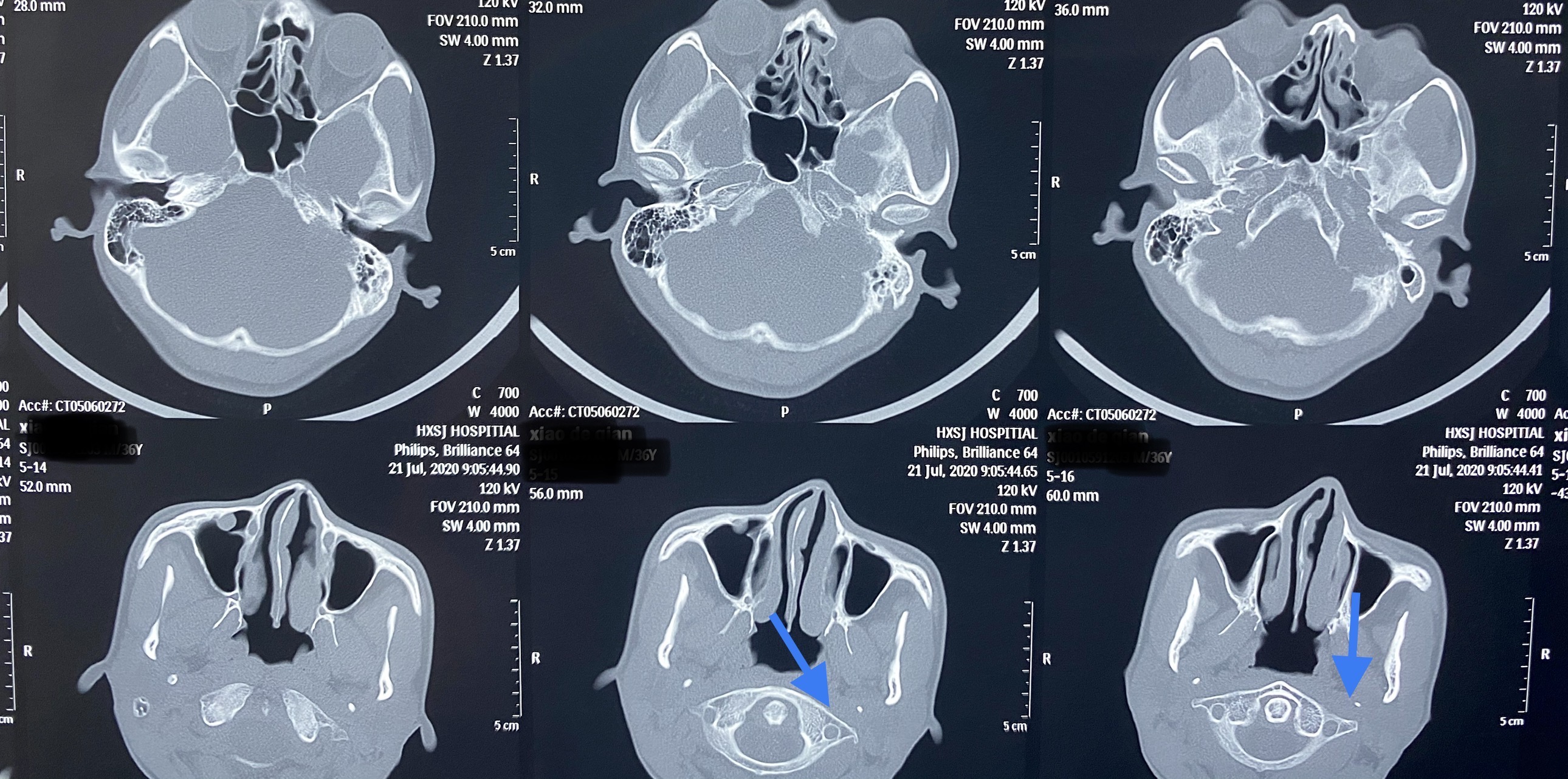 蓝色箭头指出C-1横突阻挡位于其前方的部分瘤体