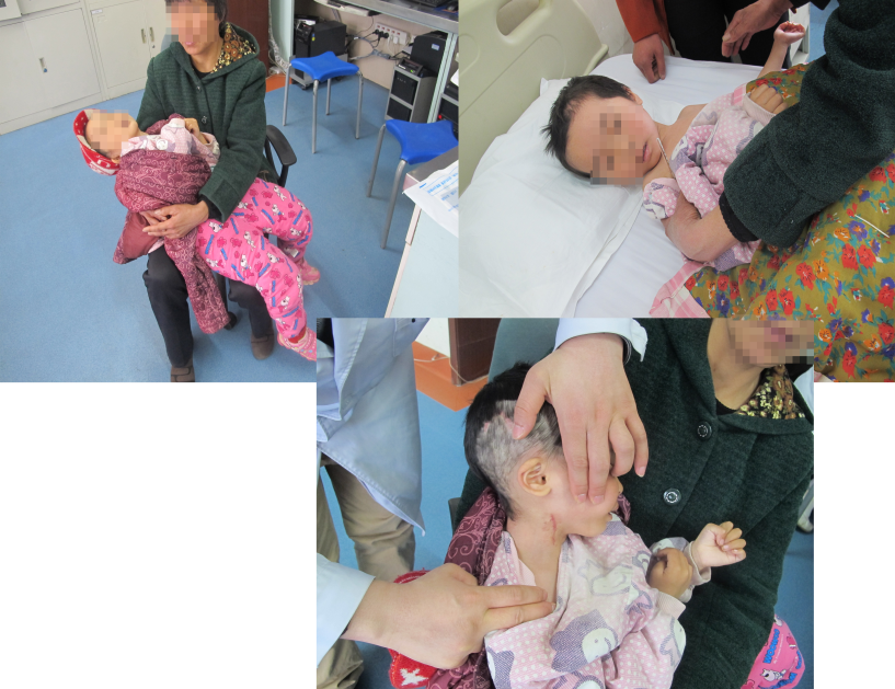 患儿于2014年3月17日(脑积水脑室腹腔分流术后7月余,失败后再行脑室心房分流术后6月余,头痛伴呕吐1周余)住入李小勇脑脊液科,入院时:神志昏睡,精神差,发热,头围外观大于正常(注:儿童迟发加重性婴儿型脑积水),因近3日进食差、间断呕吐而呈脱水貌;头颈部可见脑室心房分流术后瘢痕(图-4)。当日急查电解质,结果提示低钠血症(注:因呕吐和不能进食所致)。