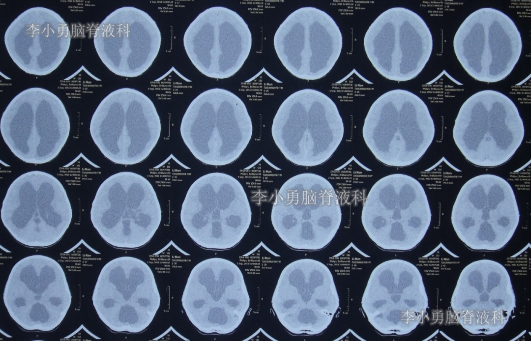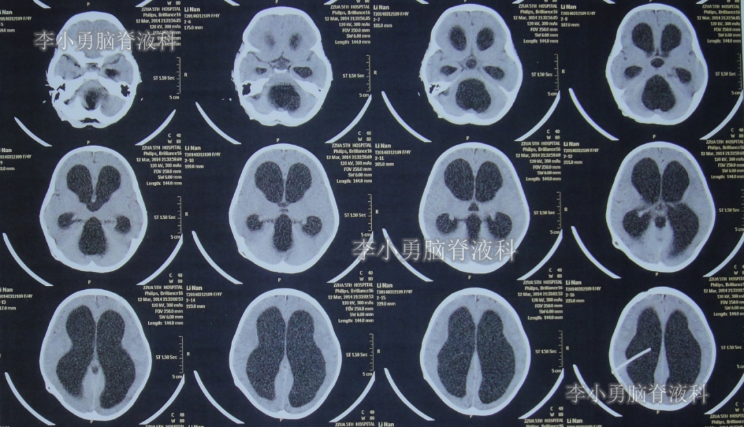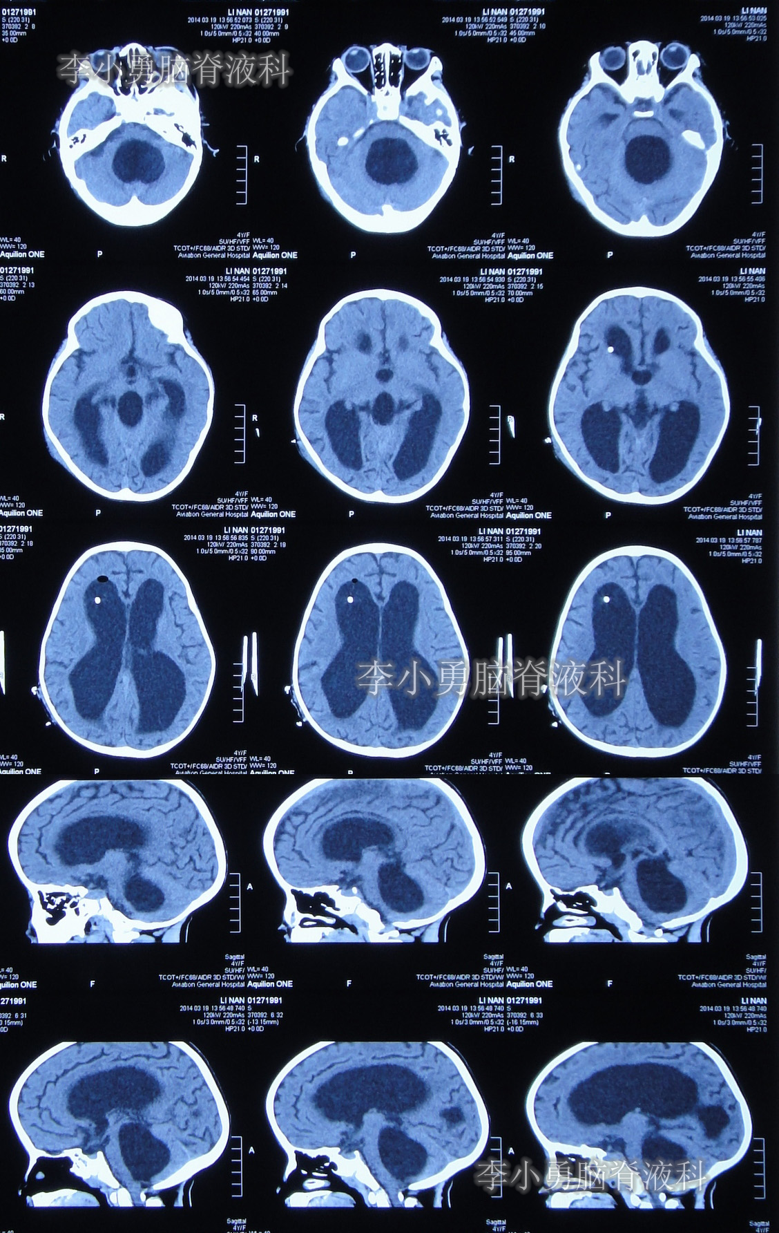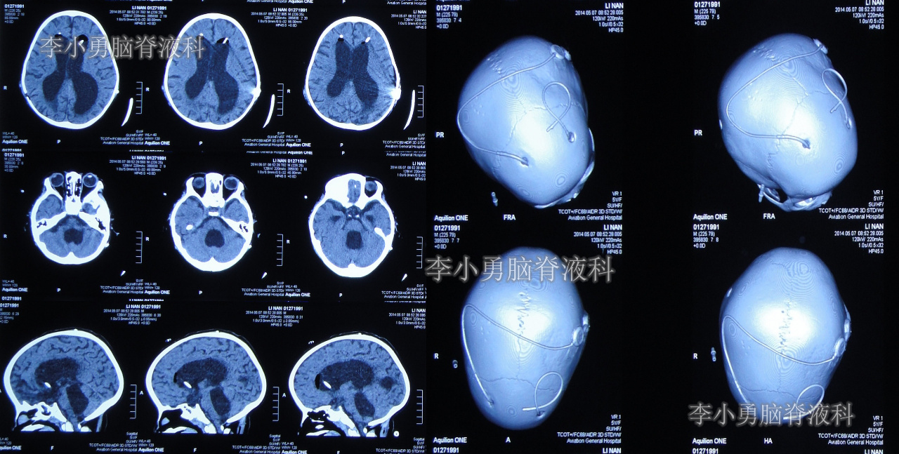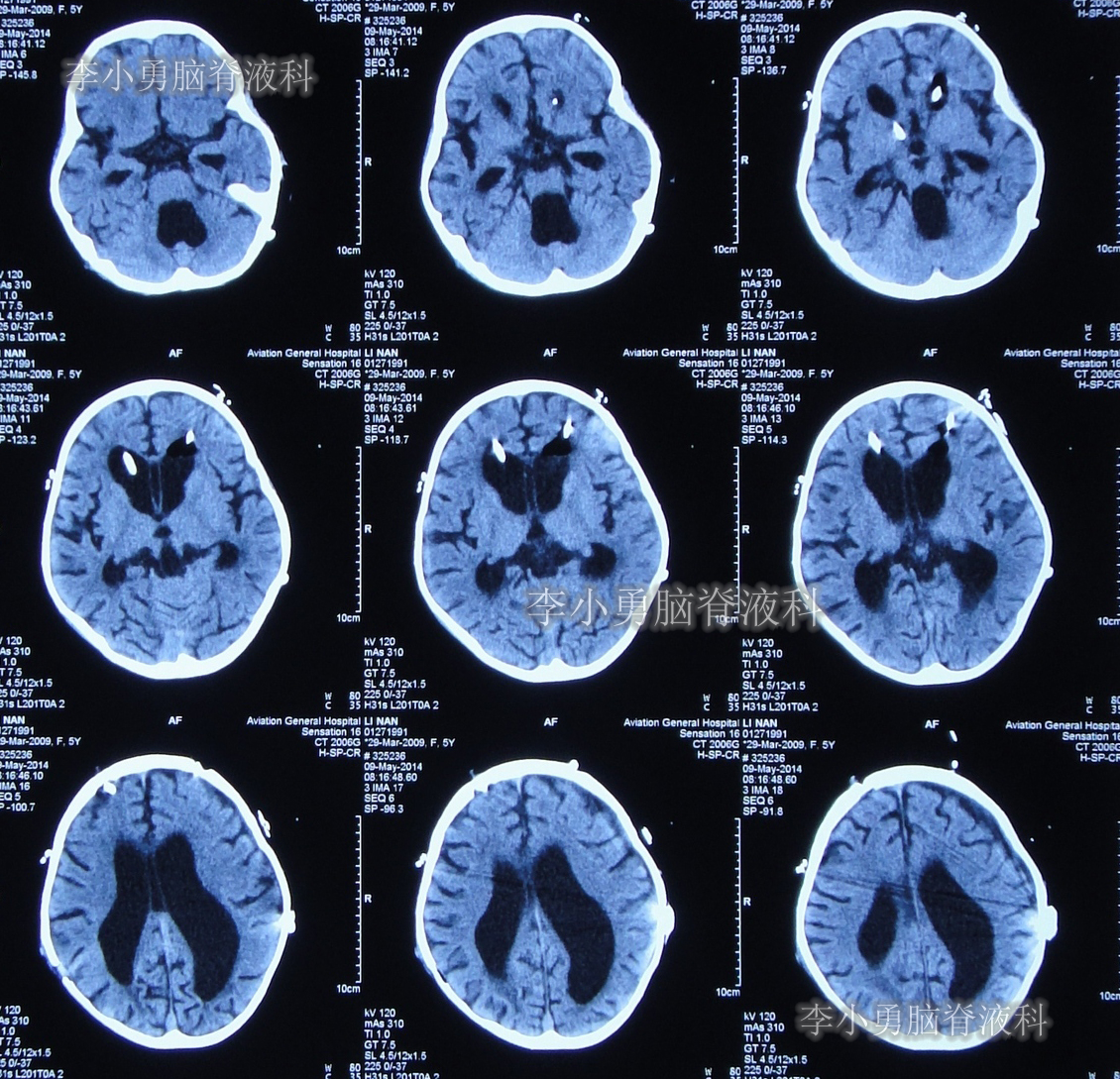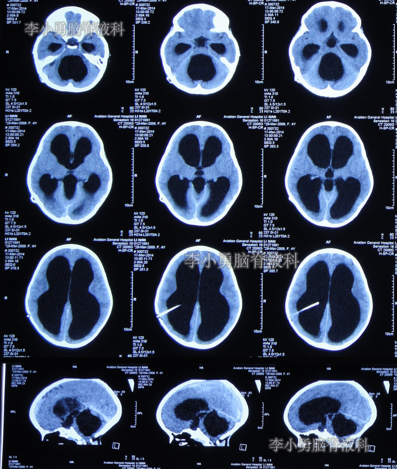 数天之后即在2013年9月2日,为治疗脑积水,患儿至河南省郑州市某三甲医院神经外科就诊,当日头颅CT示严重脑积水并第四脑室扩张严重(图-1);当天收入院。在住院后次日即2013年9月3日,进行了右侧额角脑室腹腔分流术。