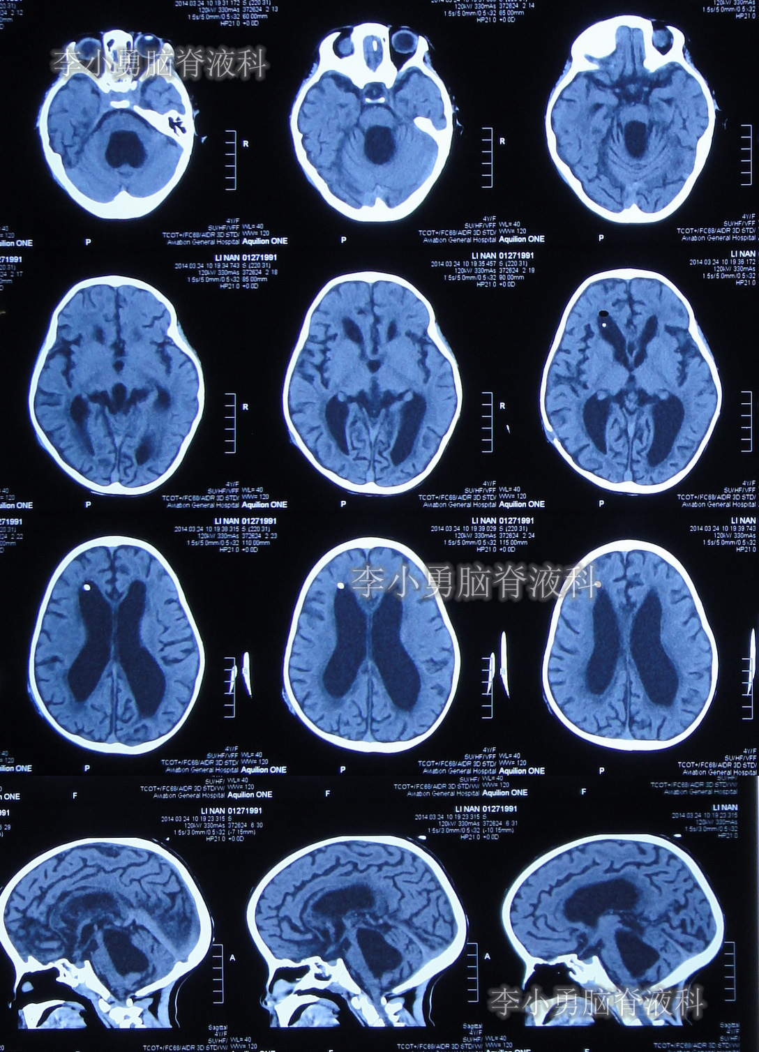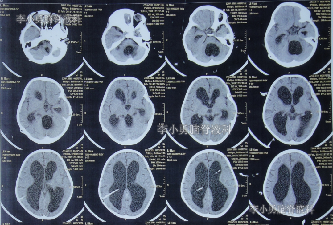 第3次住院后第10天即2014年2月21日,复查头颅CT显示脑室系统仍扩张严重(图-3)。