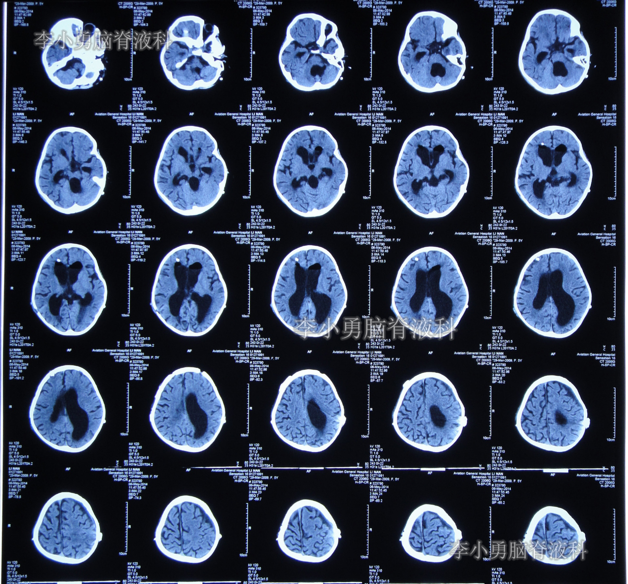 当天头颅CT示第四脑室包括在内的脑室系统全部显著扩张的表现(图-5)。