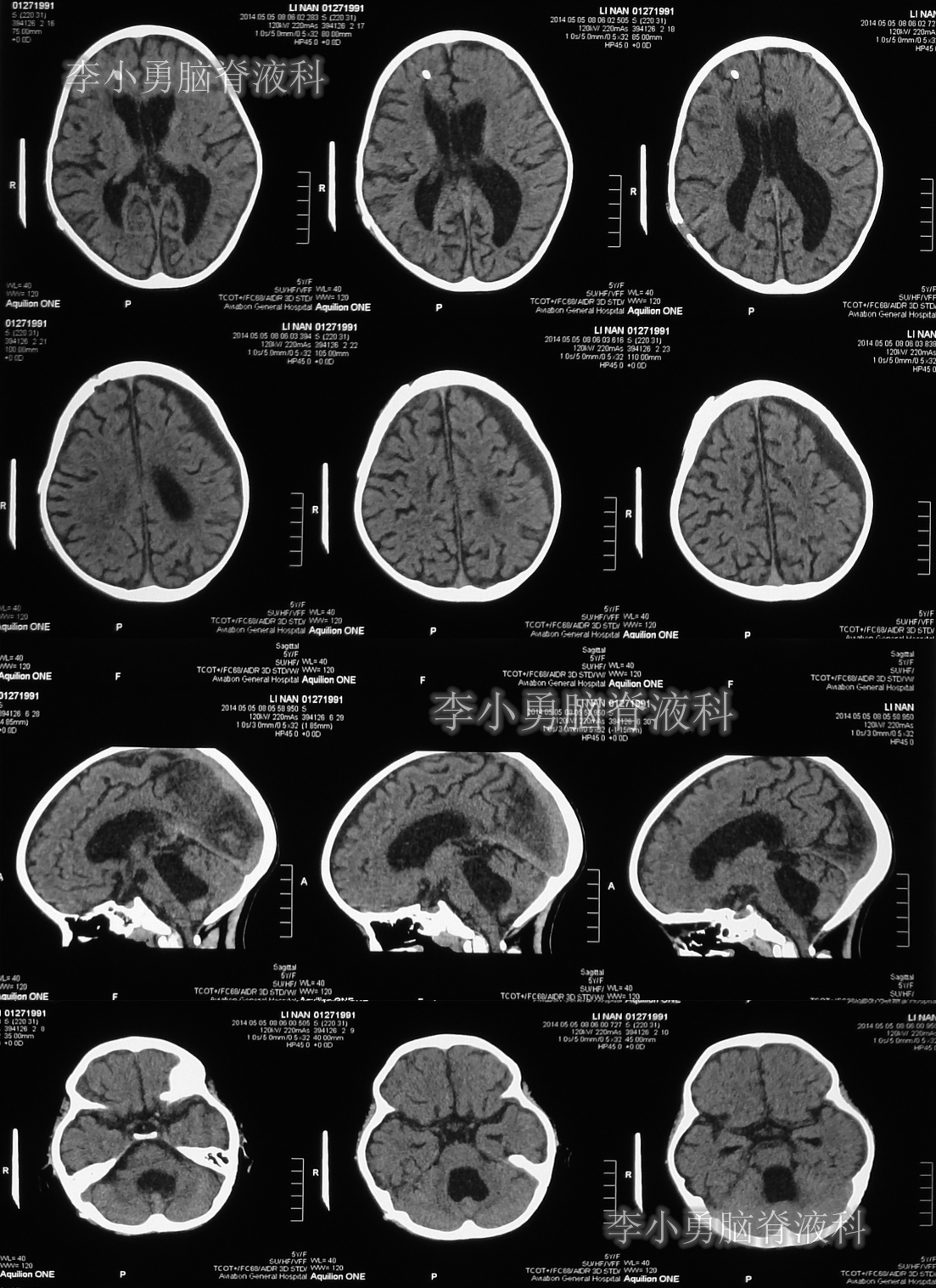 脑室外引流术后第3天即2014年5月8日,接受了脑室腹腔分流脑室端调整术;术后当日查头颅CT示脑室系统扩张减轻(图-19)。