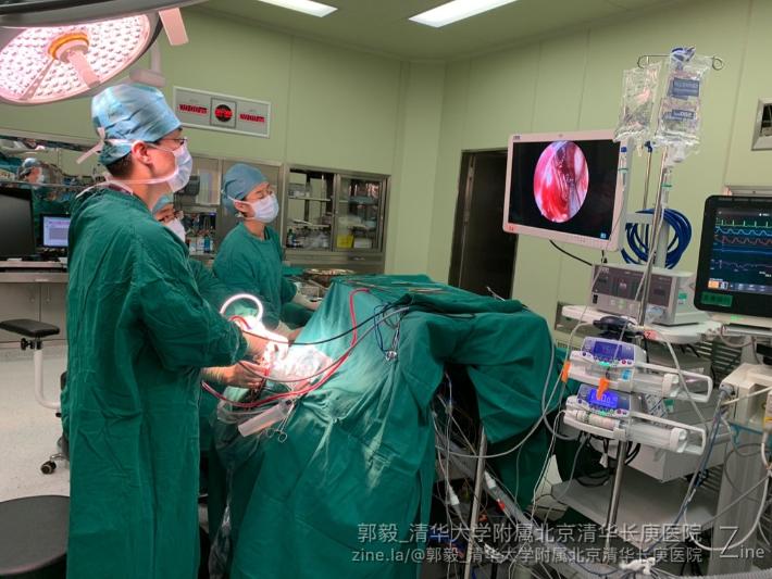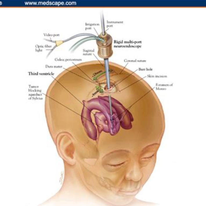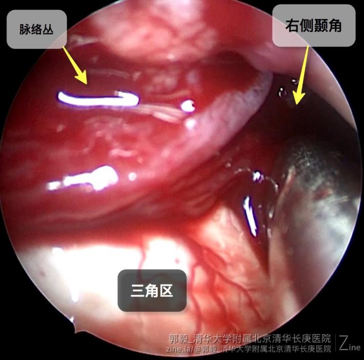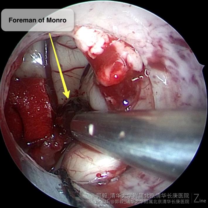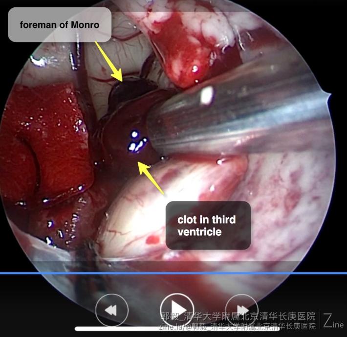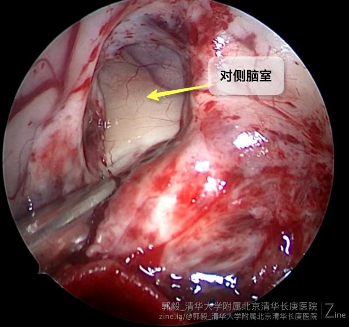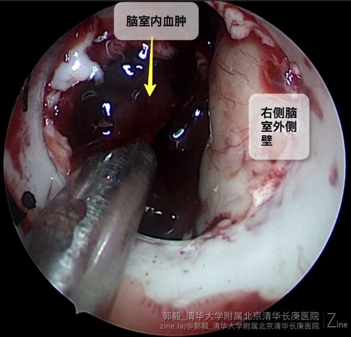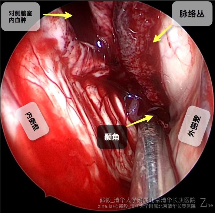 探查右侧脑室内,见对侧血肿已突破透明隔,沿脉络丛向后外下清除颞角内血肿