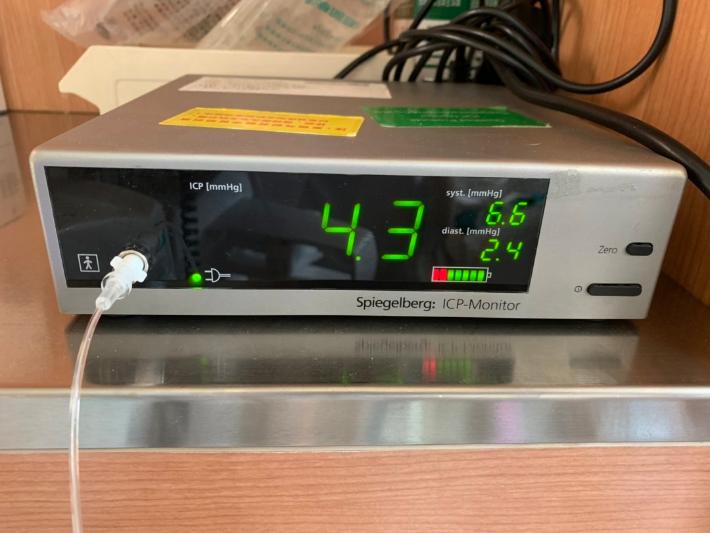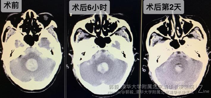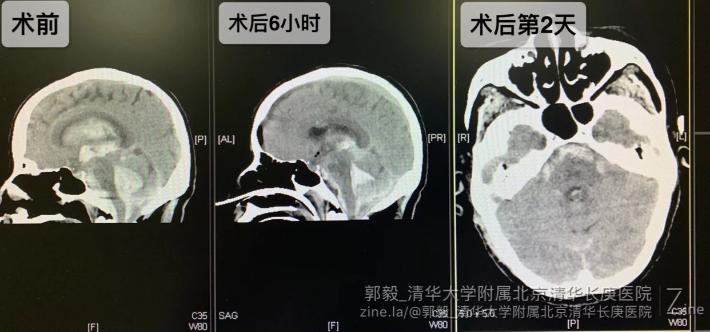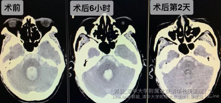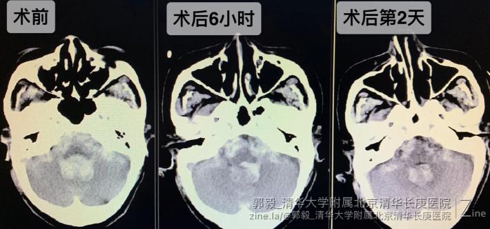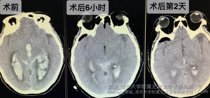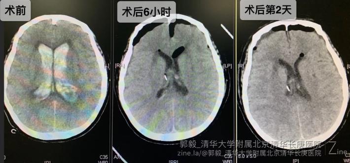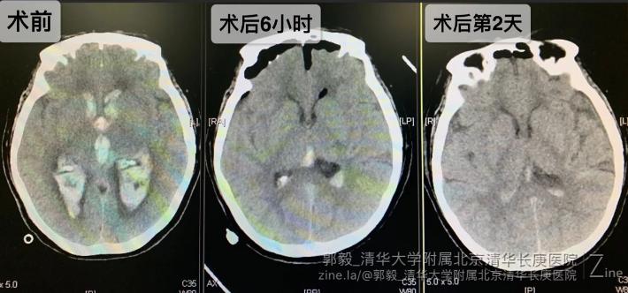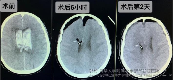 大量盐水反复冲洗脑室系统,留置脑室型ICP监护引流。术后第2天GCS E1VTM4,ICP监测<10mmHg