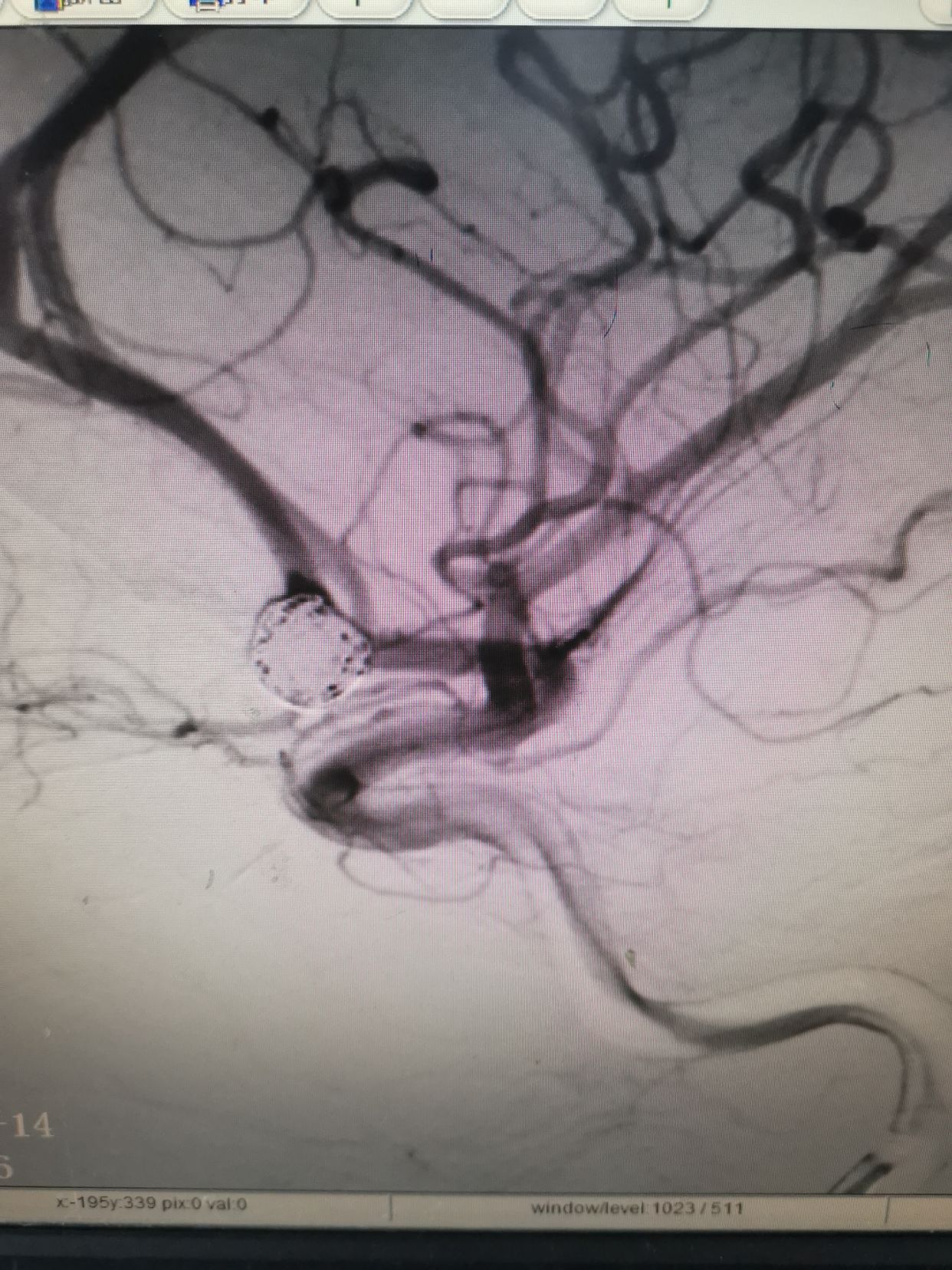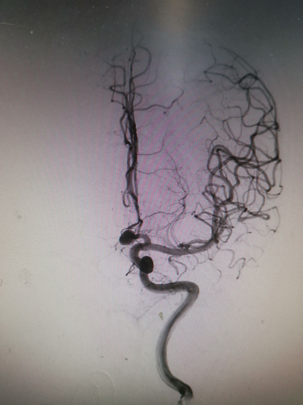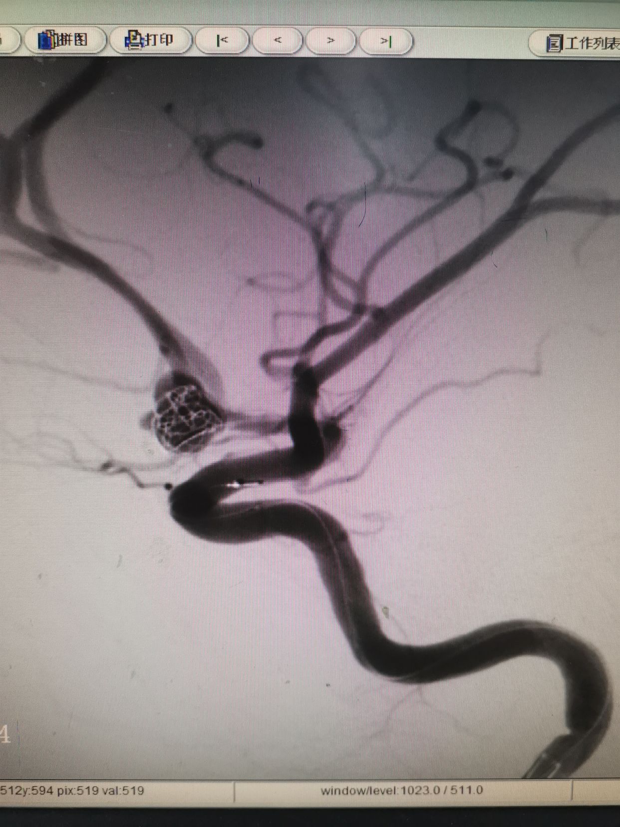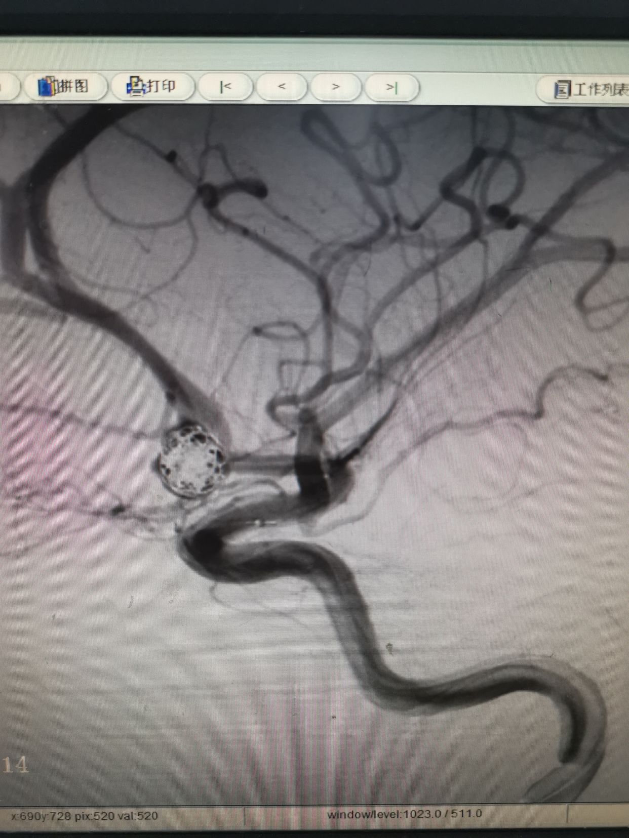左侧颈内动脉造影,发现一宽颈前交通动脉瘤。
