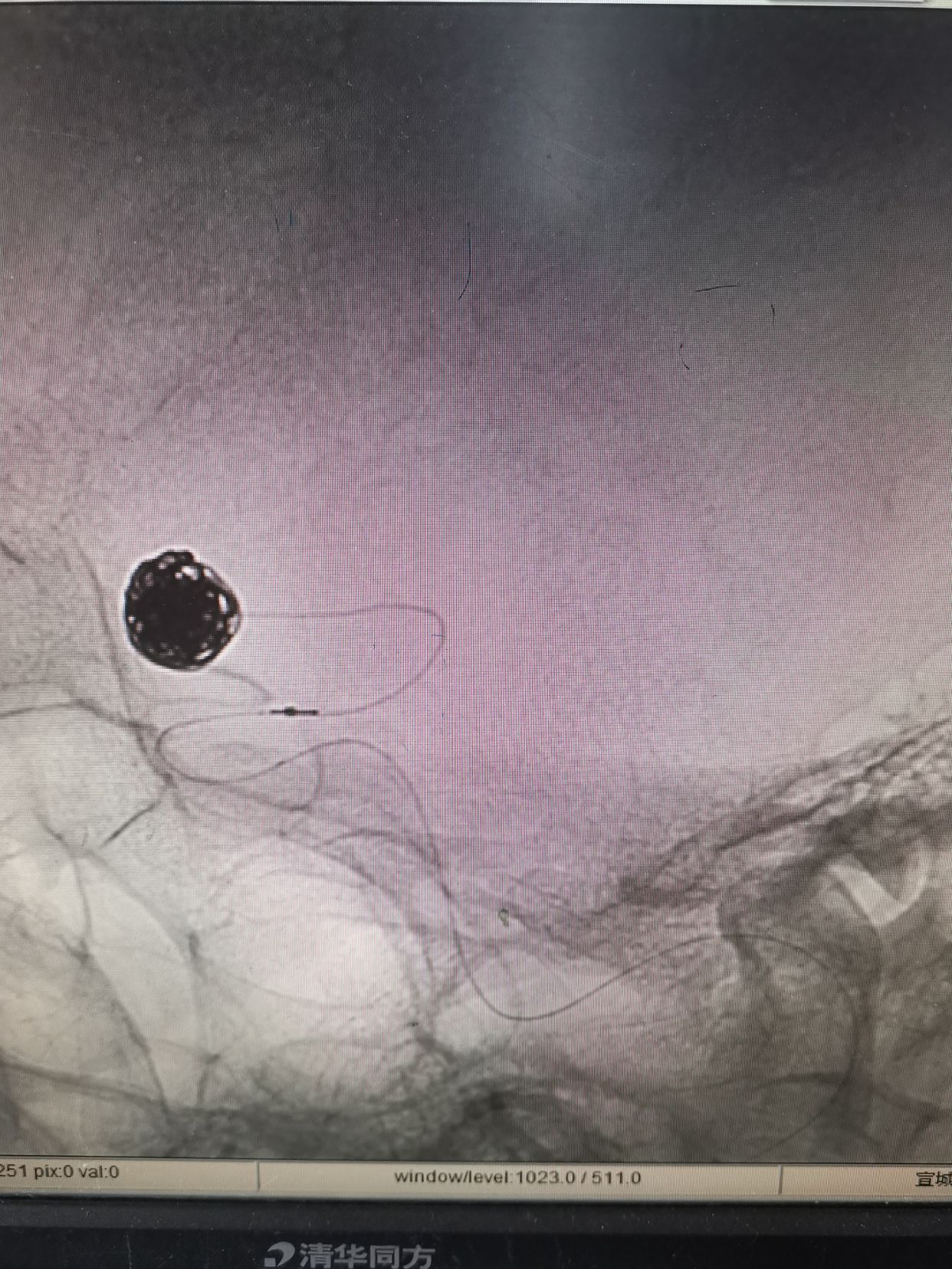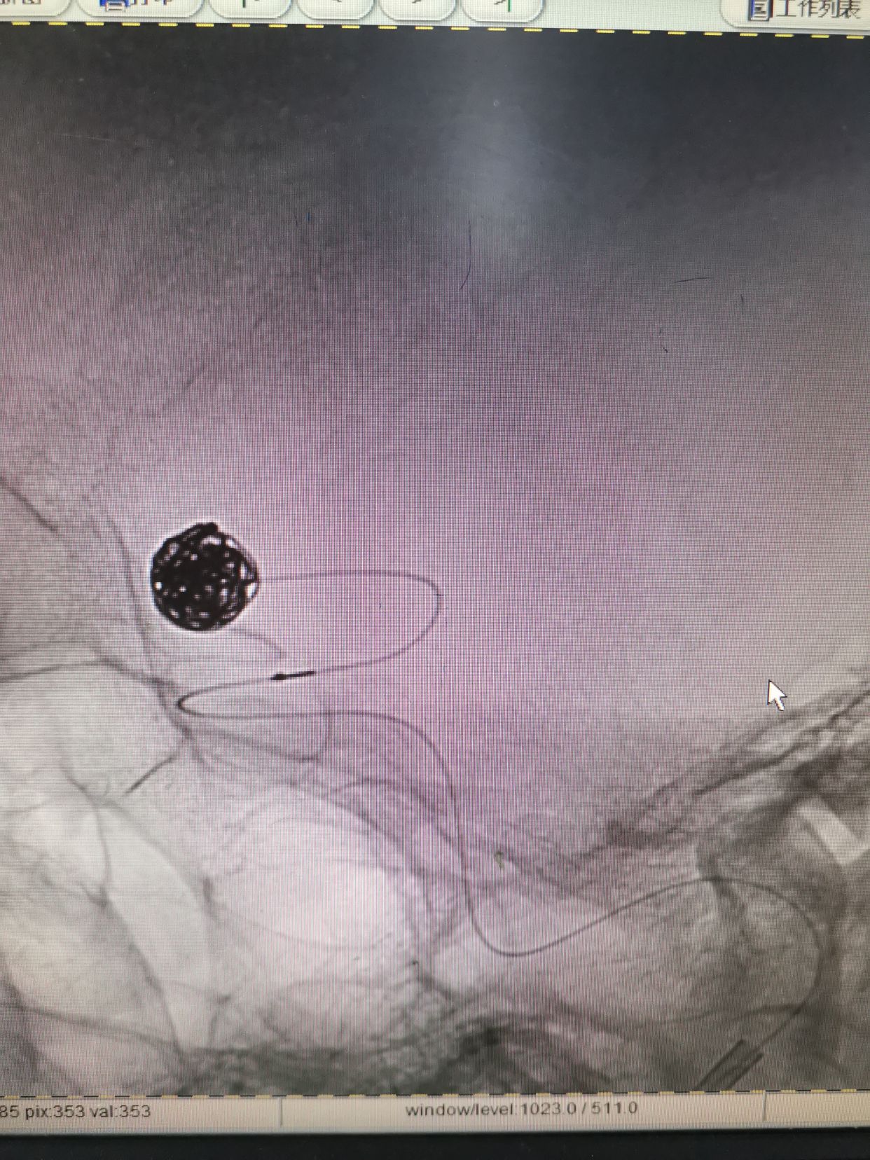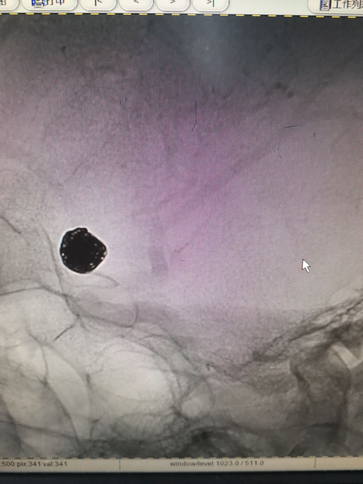 介入填塞过程顺利,用时大约半小时,期间予20%甘露醇250ml静滴。后立即转入手术室行右侧开颅脑内血肿清除术。