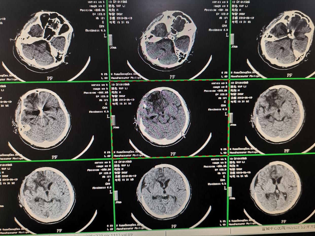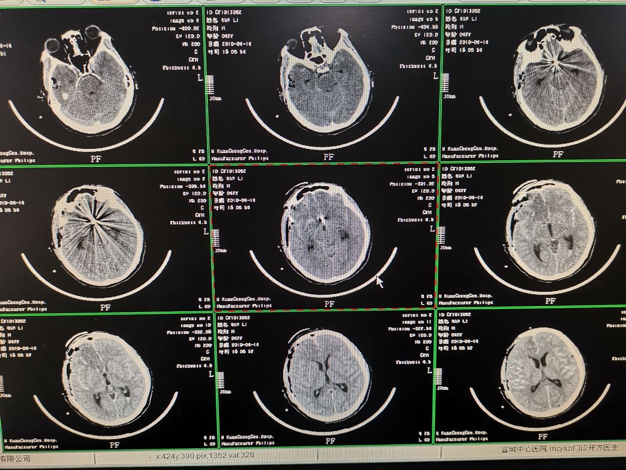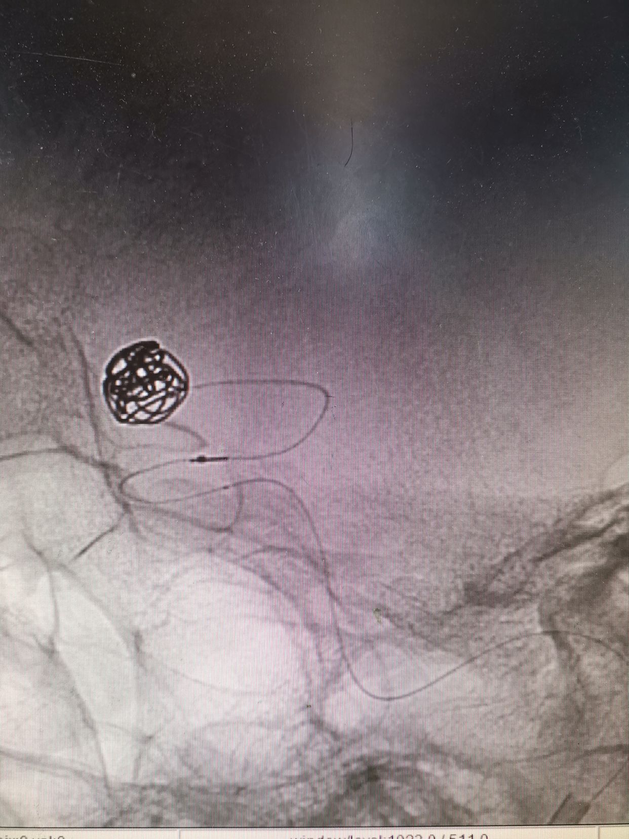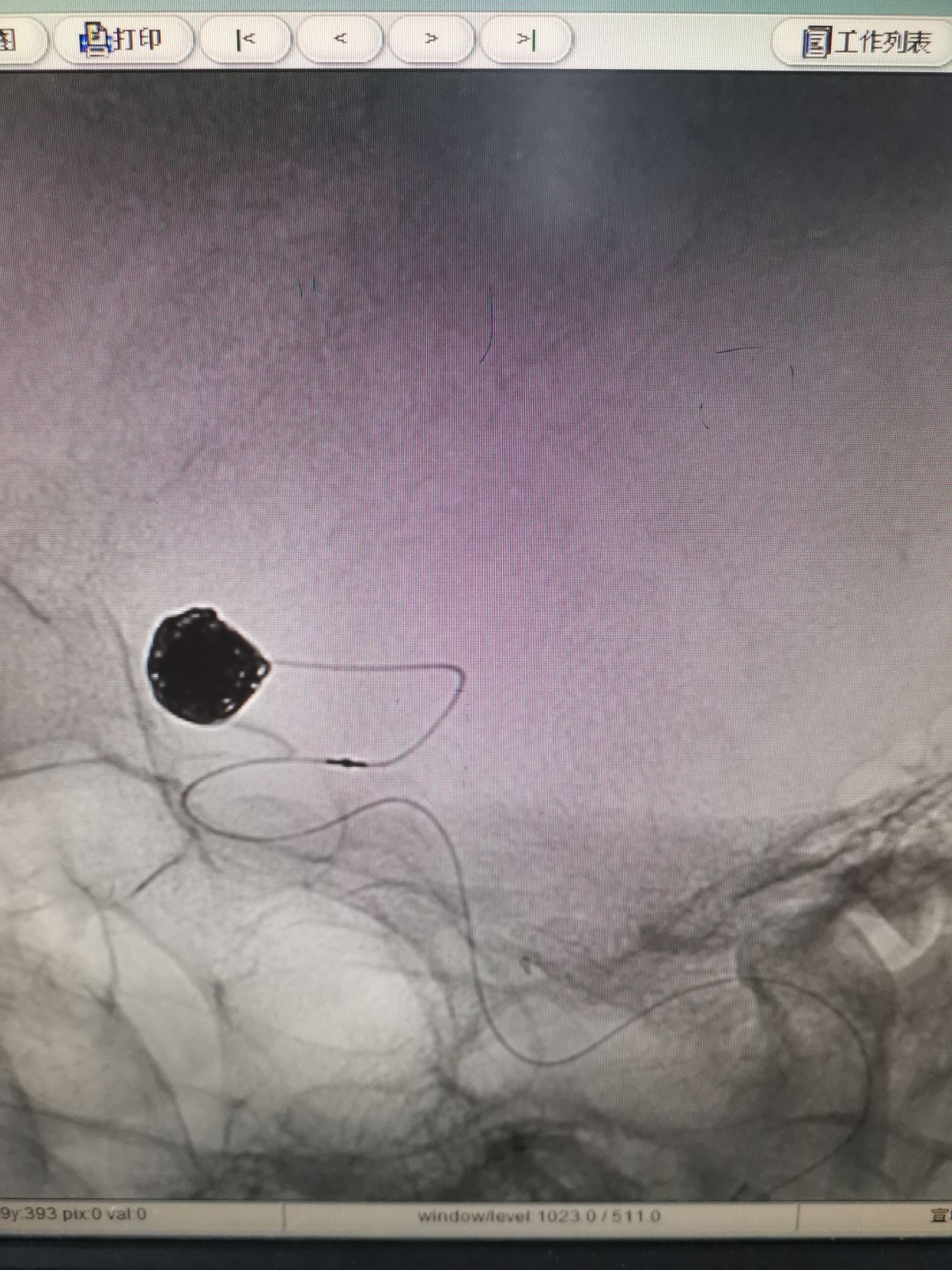 介入填塞过程顺利,用时大约半小时,期间予20%甘露醇250ml静滴。后立即转入手术室行右侧开颅脑内血肿清除术。