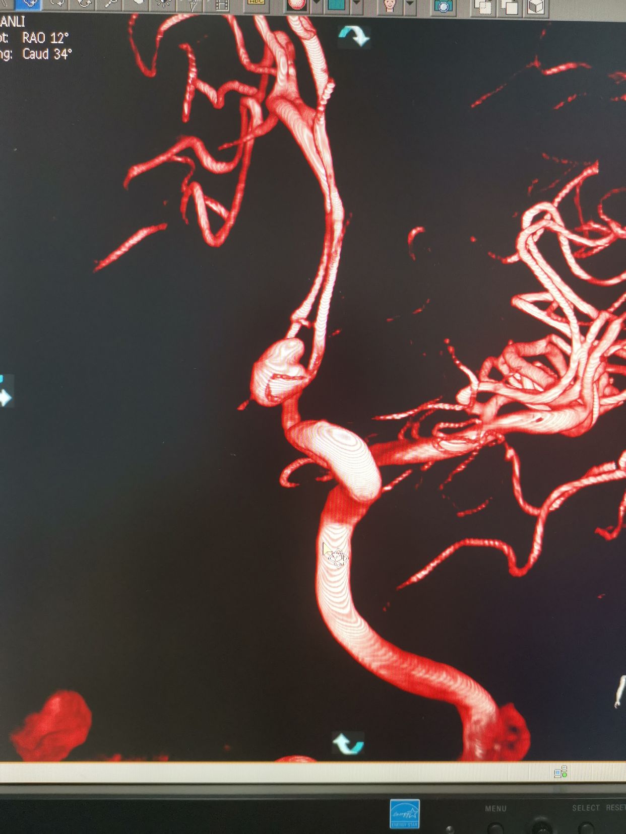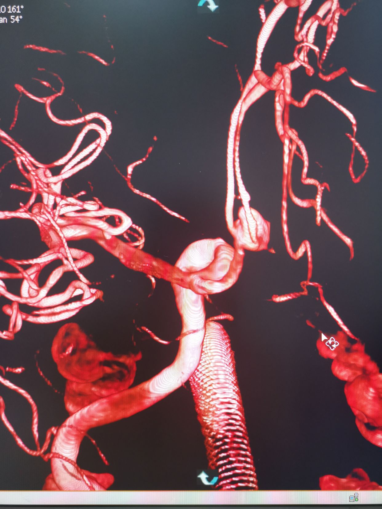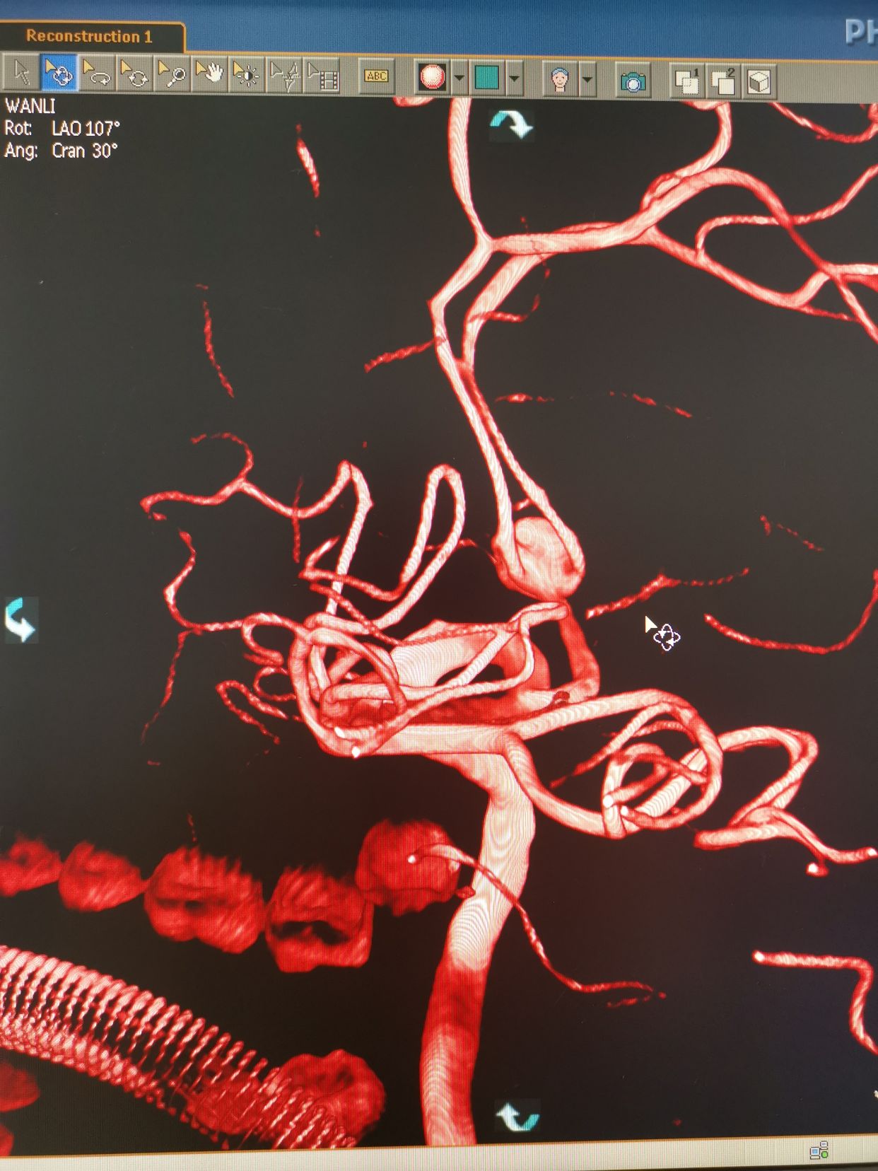造影过程中,患者出现意识障碍加深,烦躁,不能配合,考虑颅内出的增加可能。术中请麻醉科老师急诊行气管插管麻醉。后行左侧颈内动脉3D造影。
