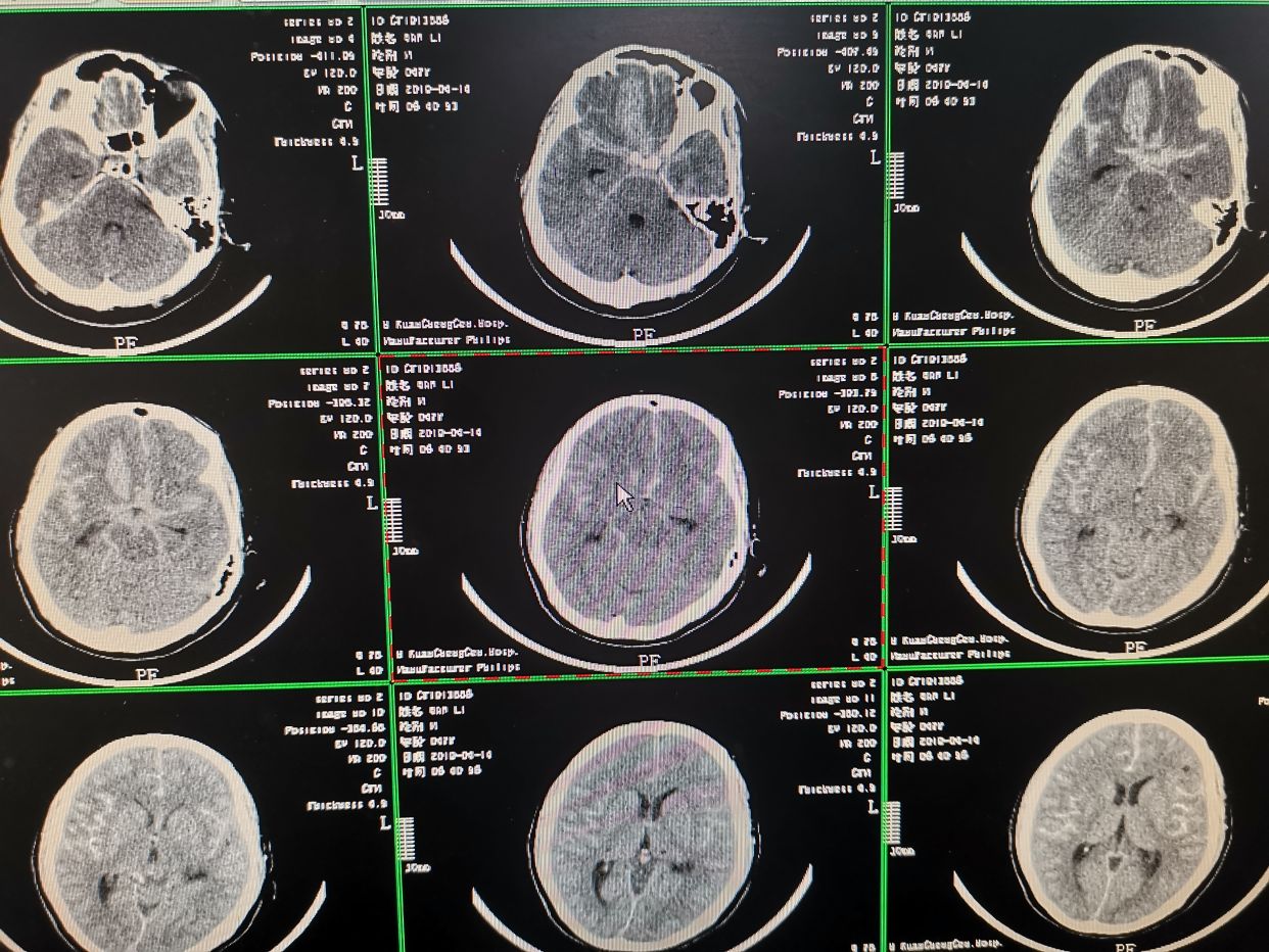 PE:BP128/89mmHg,神志清楚,精神极差。刺痛后睁眼,问答切题,配合查体。双瞳孔等大等圆,d=3.0mm,对光反射灵敏。颈抵抗。心肺腹(-)。四肢肌力V级,肌张力正常。